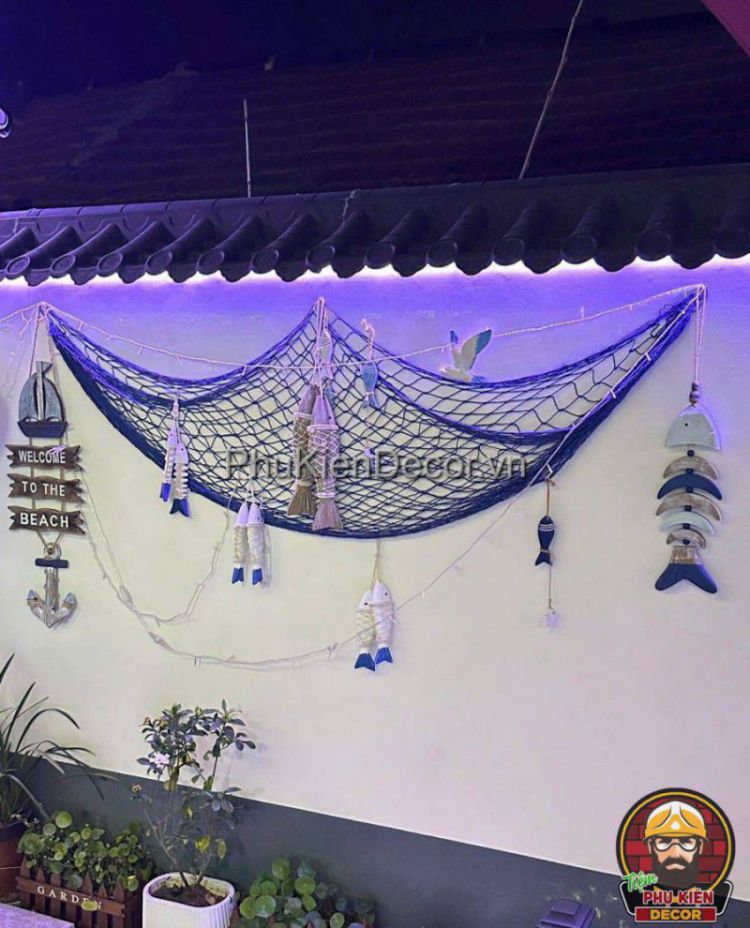 Trang trí quán café, nhà hàng: Lưới đánh cá trang trí là một lựa chọn tuyệt vời cho những quán café, nhà hàng có chủ đề biển. Bạn có thể kết hợp lưới với các phụ kiện trang trí như đèn lồng, vỏ ốc, sao biển, tạo ra một không gian nhẹ nhàng và ấm cúng cho khách hàng.
