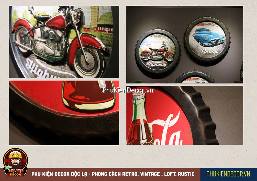 Nắp Bia trang trí với các dạng mẫu Mô tô, Ô tô, Beer... với phong cách Retro, Vintage. Giúp trang trí các không gian cho quán Cafe, Beer, Pub, Baber Shop... hay các Không gian cần sự Nam tính, Mạnh mẽ và Khác biệt. Việc Trang trí các bức tường cho Quán Cafe, Beer sẽ trở nên dễ dàng hơn khi Bạn đã sử dụng Nắp Beer Decor, thay thế cho các Bức tranh thông thường.