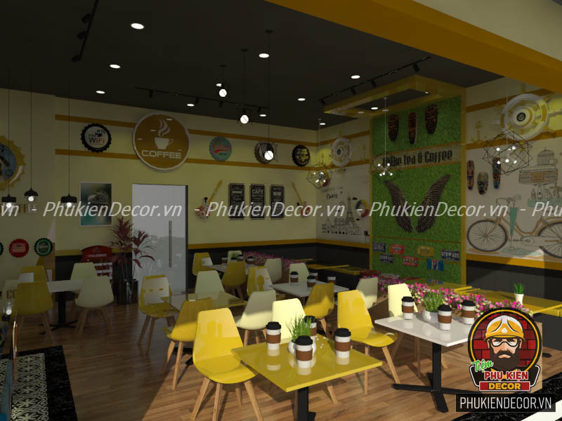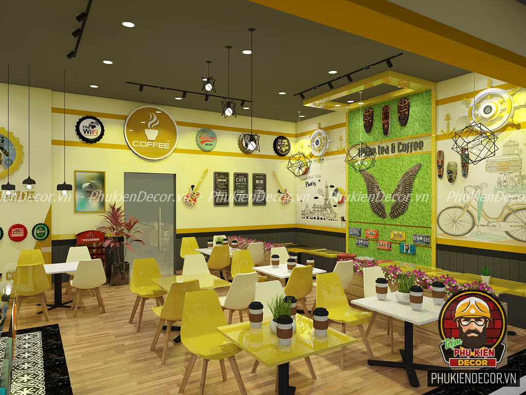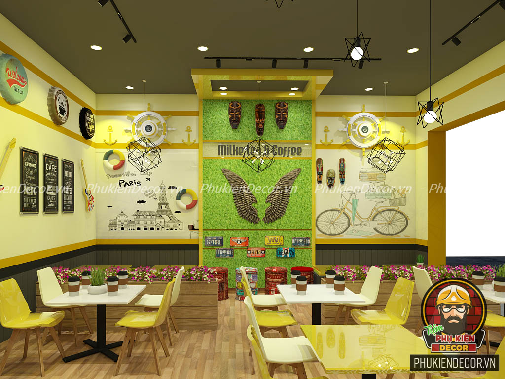 Ngoài ra, để trang trí một Quán Trà sữa dù diện tích nhỏ nhưng vẫn đẹp và dễ thương, Bạn không thể thiếu một số món đồ giúp nội thất Không gian Quán Bạn ấn tượng, như là :