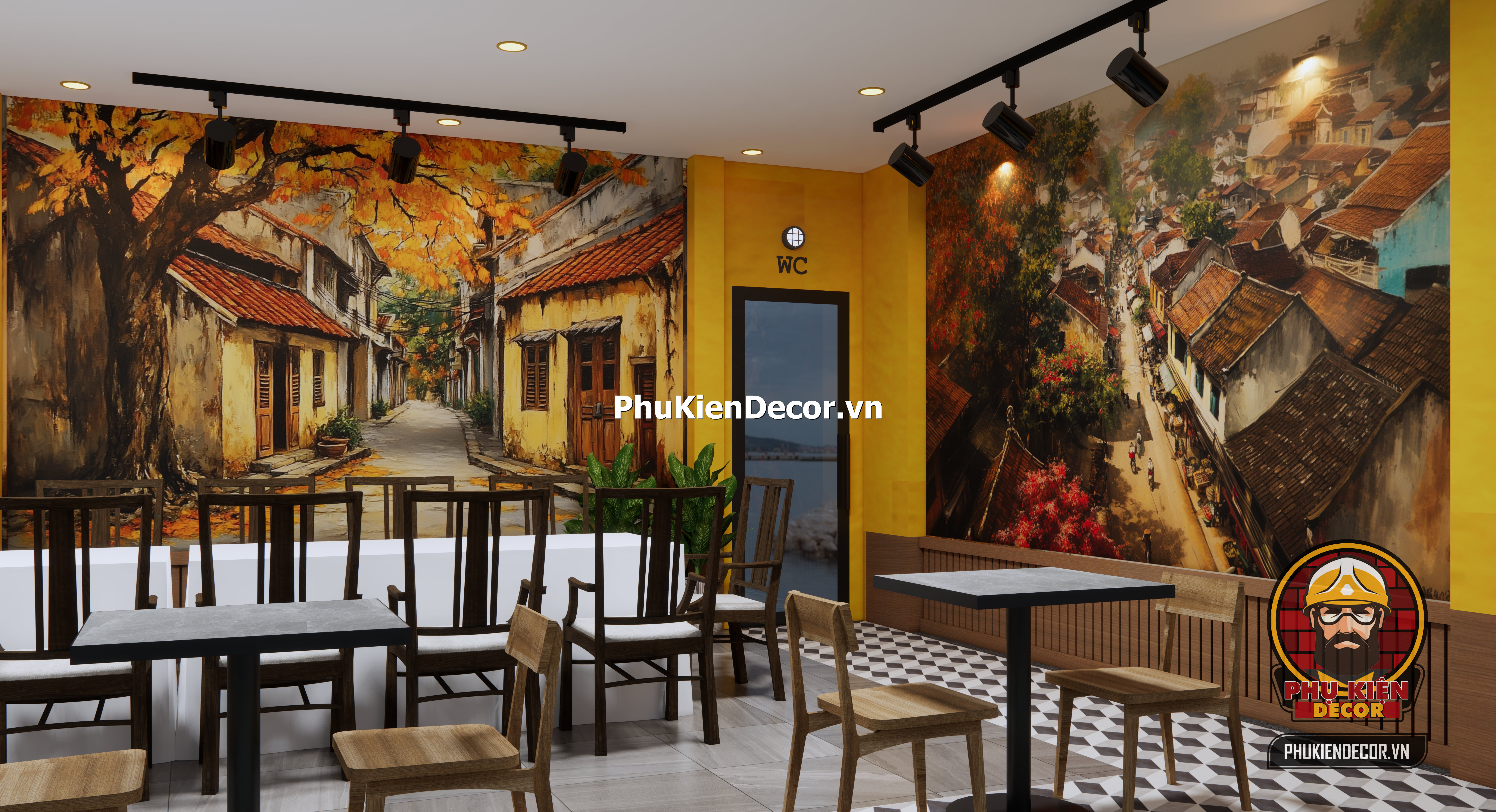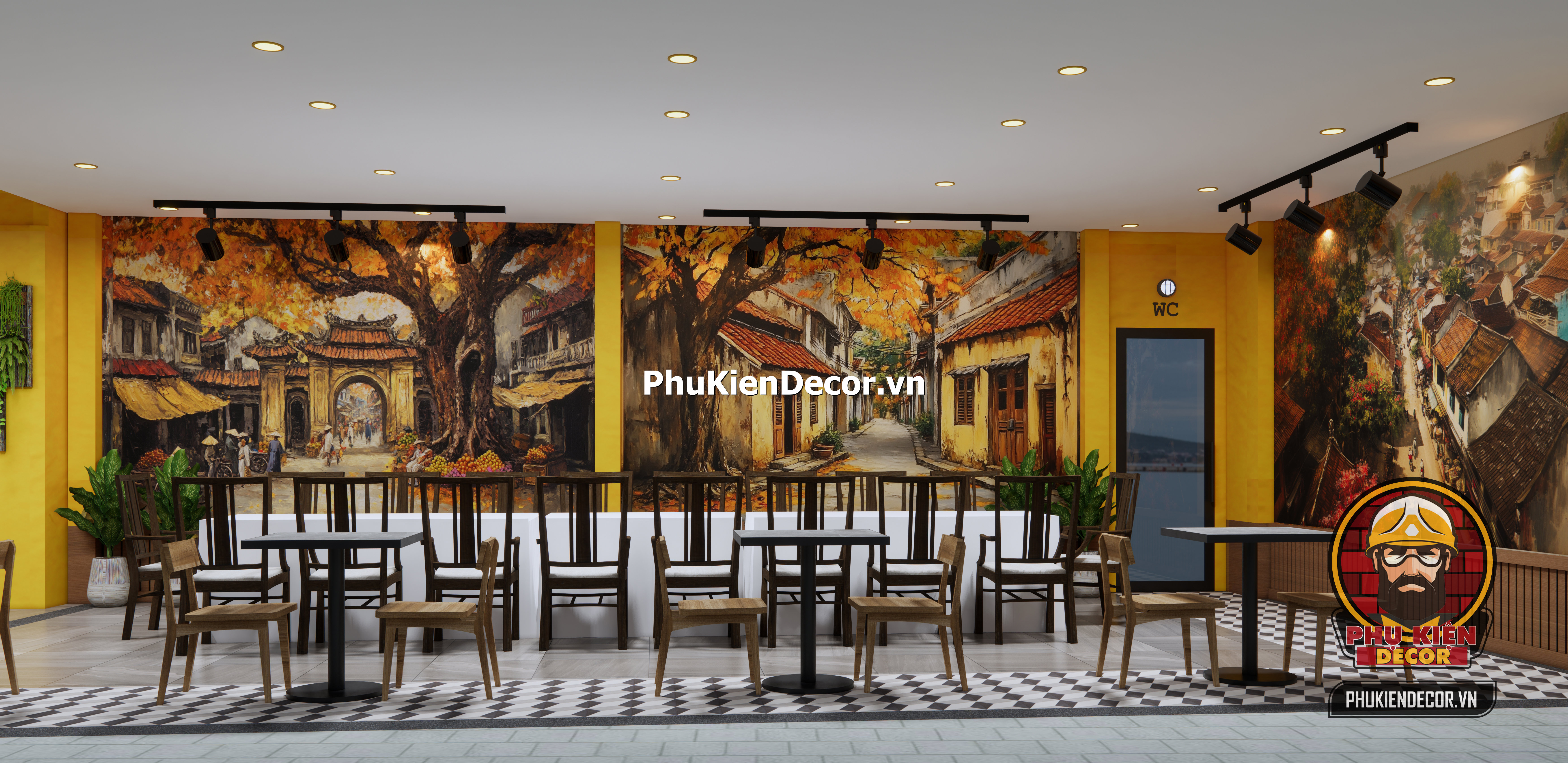 Với kho tranh dán tường 3D chủ đề Hà Nội xưa độc quyền, Phụ Kiện Decor mang đến hàng trăm mẫu tranh được thiết kế riêng, từ tranh phố cổ, tranh thời bao cấp, cho đến các chủ đề hiện đại mang hơi thở Hà Nội đương đại. Tất cả đều có thể in khổ lớn theo kích thước thực tế của từng quán, đảm bảo vừa vặn và sắc nét. Không chỉ dừng lại ở tranh, Phụ Kiện Decor còn cung cấp đầy đủ file thiết kế quán phong cách Hà Nội xưa và các phụ kiện decor đồng bộ như đèn treo, mẹt tre, bảng hiệu, bàn ghế mộc – giúp bạn dễ dàng triển khai thi công hoặc setup dù ở bất cứ đâu.
