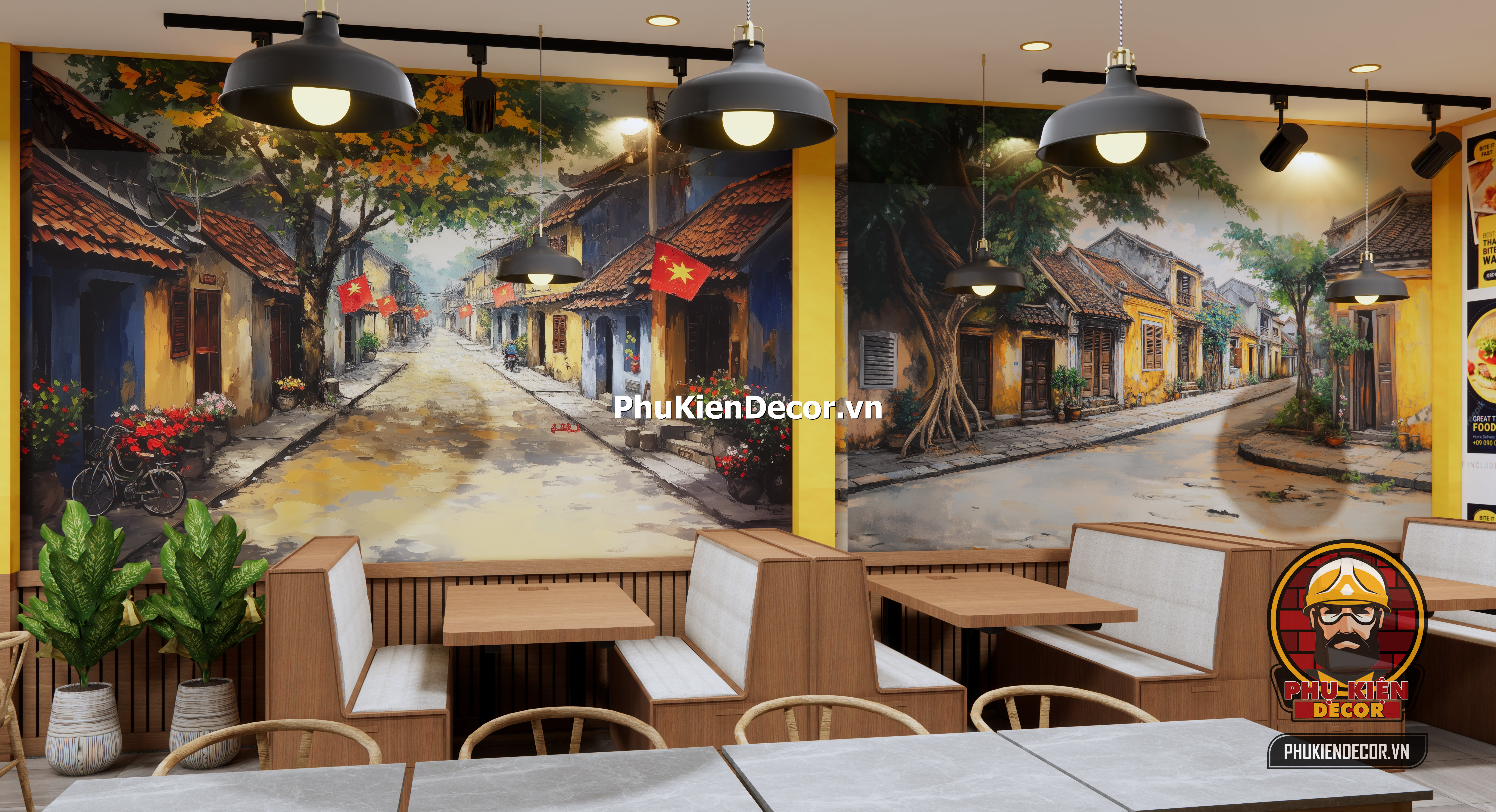 Mẫu setup quán ăn Hà Nội xưa,tường vẽ phố lòng vẽ thương