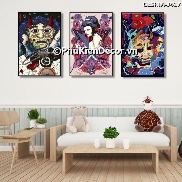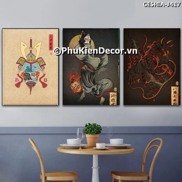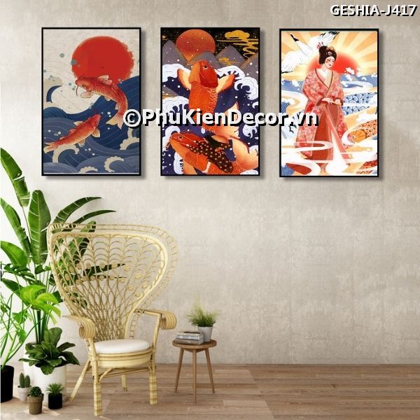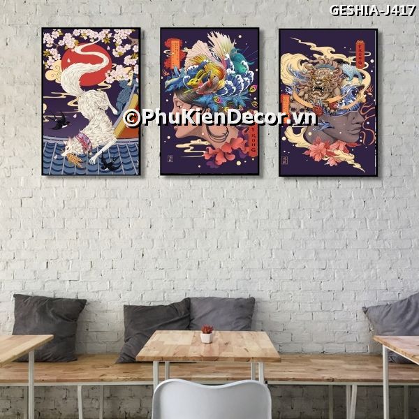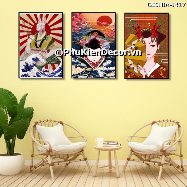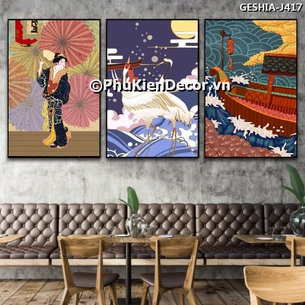 Những bức tranh tinh tế tái hiện cô gái Geisha với trang phục truyền thống, kèm theo khuôn mặt dịu dàng và đôi mắt sâu thăm thẳm. Bức tranh không chỉ thu hút ánh nhìn bởi vẻ đẹp của người mẫu mà còn mang đến cảm giác trải nghiệm trực tiếp văn hóa Nhật Bản. Những bức tranh này sẽ làm mới không gian sống và làm việc, đồng thời tạo điểm nhấn văn hóa độc đáo và lôi cuốn, truyền tải tình yêu nghệ thuật và câu chuyện văn hóa đặc sắc trong không gian của mình.