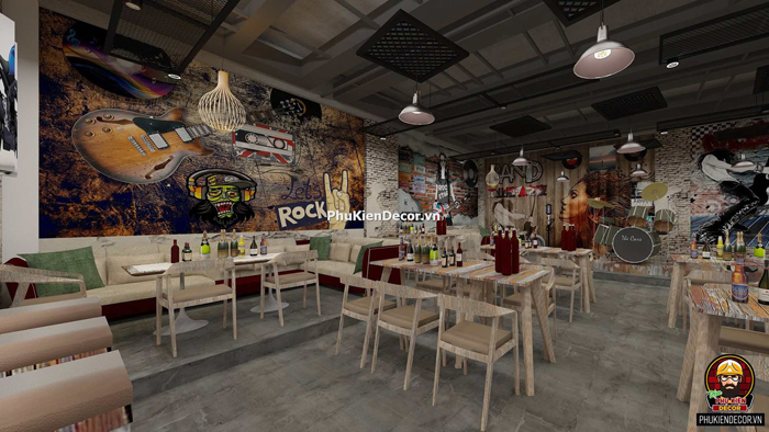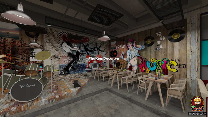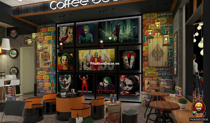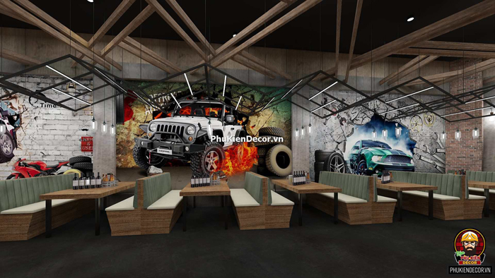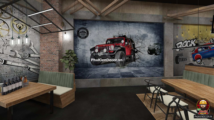 Khi trang trí Quán không thể không nhắc đến việc tạo điểm nhấn cho Quán với các bức tường sử dụng Decal tranh dán tường 3D khổ lớn. Với cách làm này sẽ khiến cho không gian Quán được nâng lên một tầm mới. Tạo cảm giác cho khách hàng sang trọng, chân thực và gần gũi hơn.