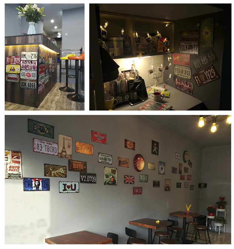 Tranh thiếc Biển số xe decor lấy cảm hứng từ phong cách trang trí kiểu Châu Mỹ, với các bức tường gỗ thô mộc được trang trí cá tính bằng việc sắp xếp lộn xộn các mẫu biển số xe cổ lại với nhau. Sự xuất hiện của nhiều màu sắc và chữ số lên bức tường, làm cho tổ hợp tranh thiếc biển số nổi bật, tạo nên một không gian mạnh mẽ, chất và cực ngầu.
