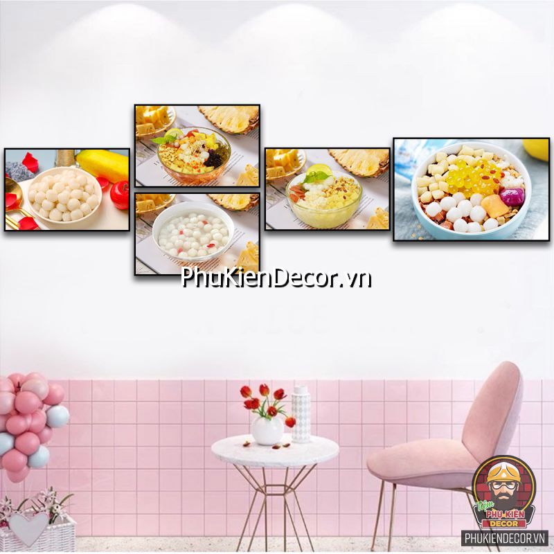Bức tranh chứa hình bánh, trái cây và những thức uống tổng hợp là một mẫu tranh phổ biến nhất hiện nay. Phong cách trang trí này phù hợp cho nhiều cửa tiệm khác nhau với quy mô từ nhỏ đến lớn đều có thể áp dụng được. Hơn nữa, qua những hình ảnh thể hiện trong bức tranh, khách hàng dễ dàng nắm rõ thực đơn, menu quán có gì. Từ đó lựa chọn, gọi món nhanh hơn.