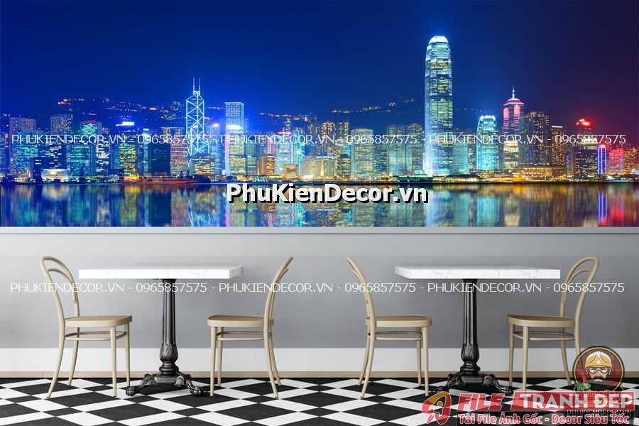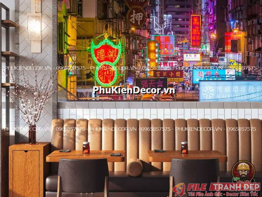 1. Tranh dán tường 3D trang trí quán phong cách đường phố, phong cảnh Hong Kong tạo nên một không gian nổi bật, độc đáo, giúp thực khách được trải nghiệm chân thực các món ăn của Hồng Kông