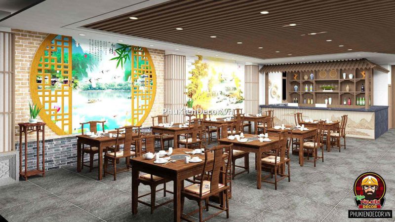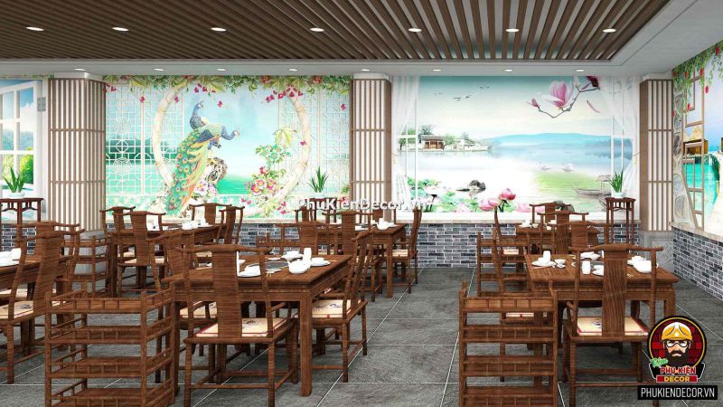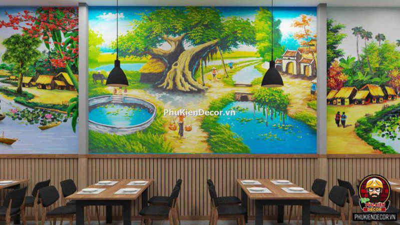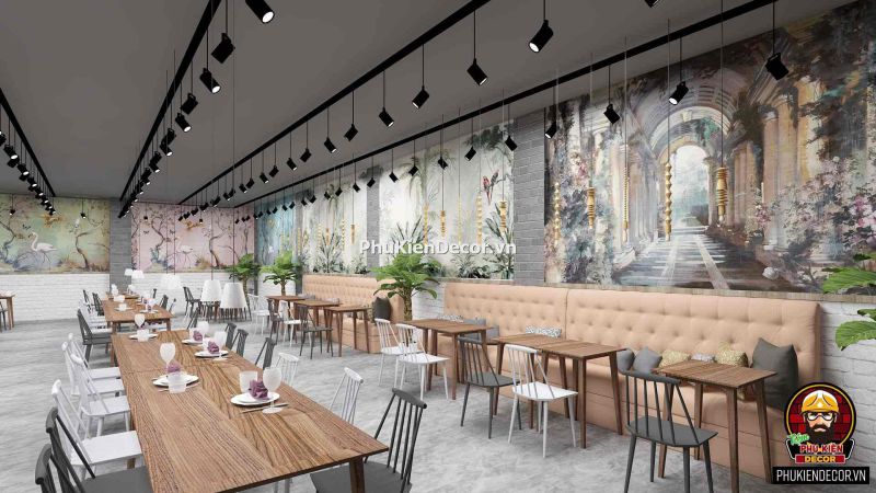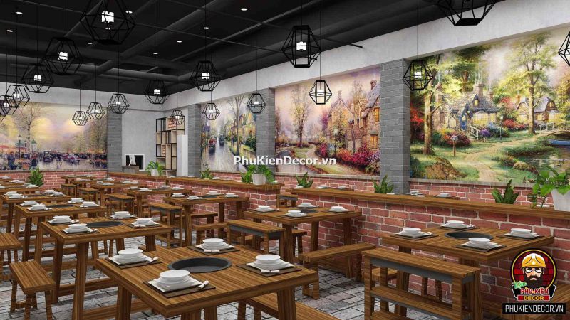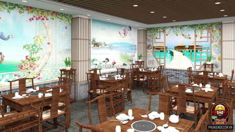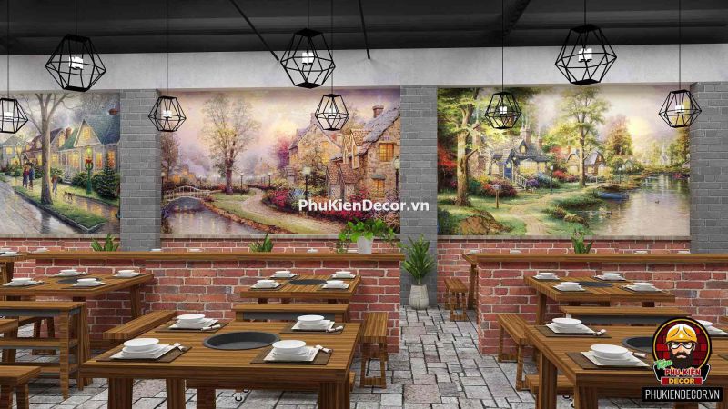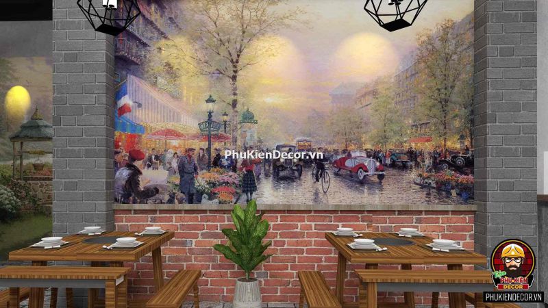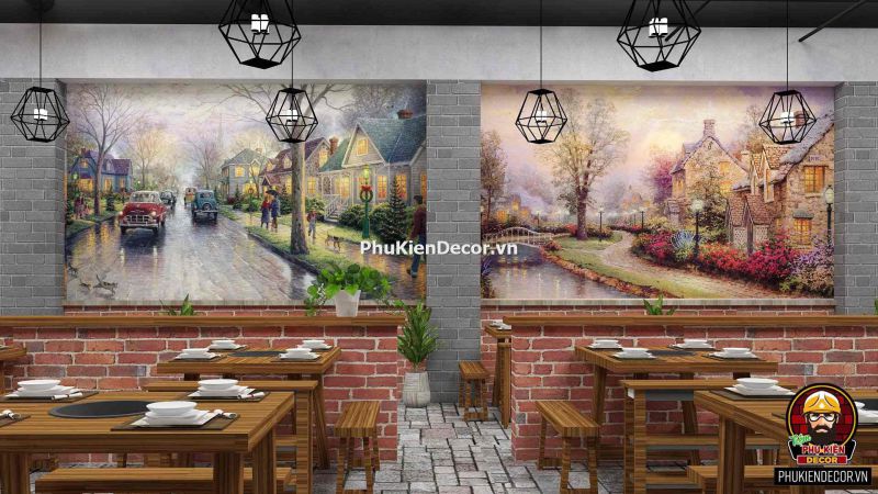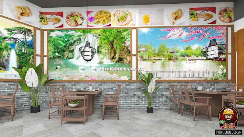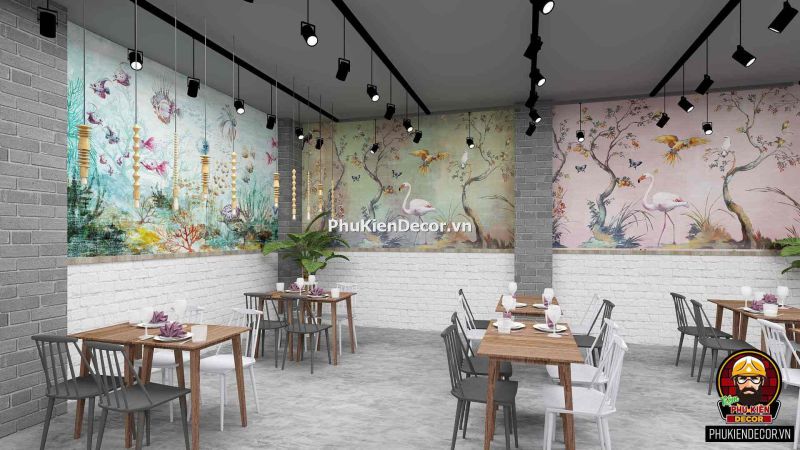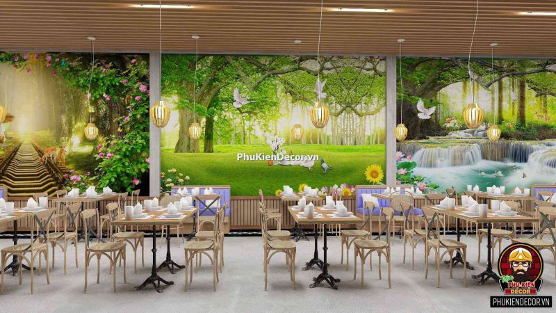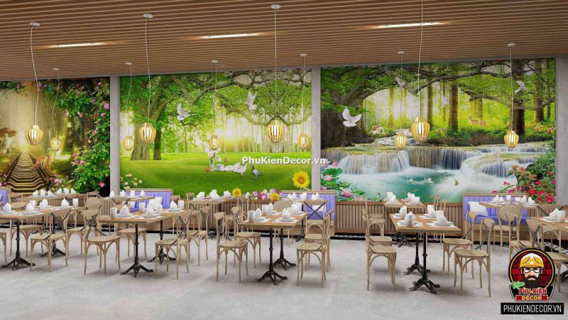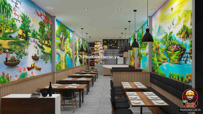1. Demo các mẫu tranh dán tường 3D trang trí quán ăn, nhà hàng đẹp, thu hút, tạo không gian nổi bật, khác biệt, thu hút khách hàng