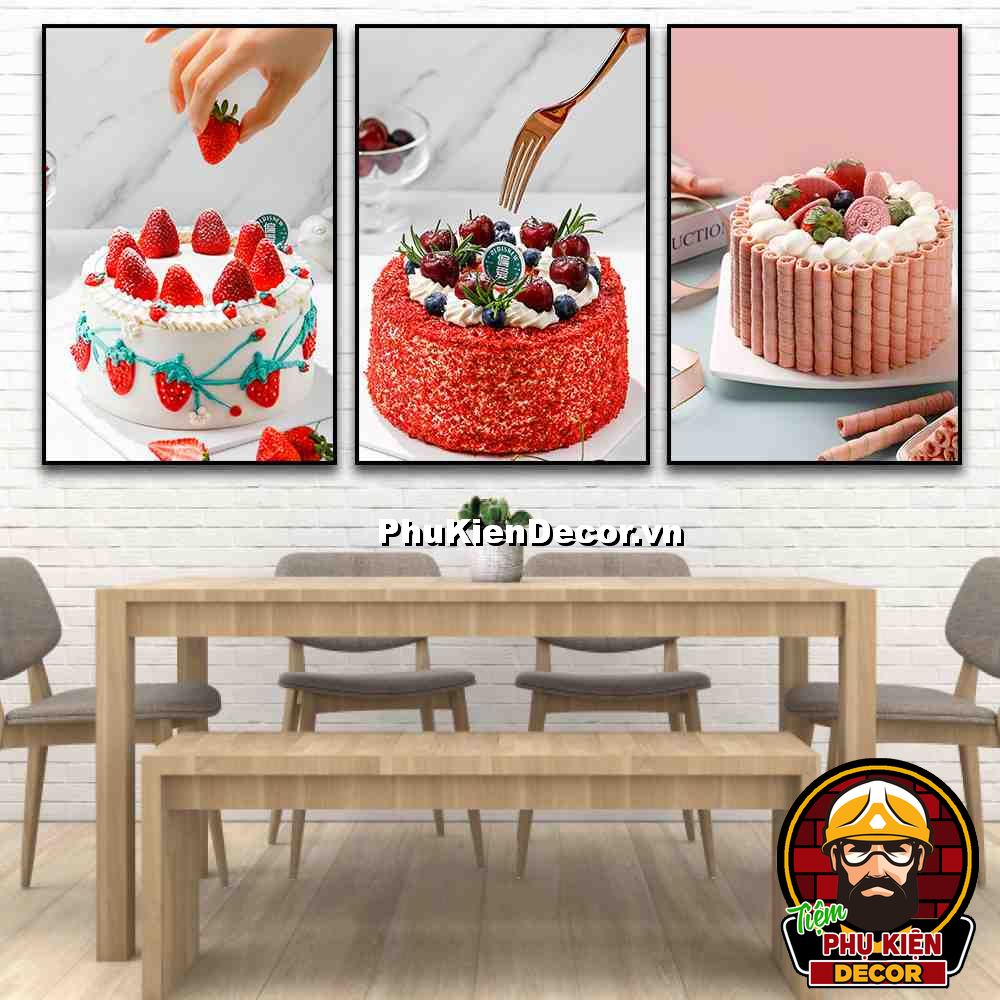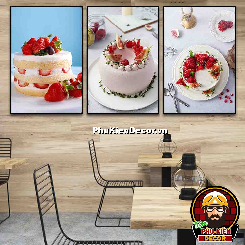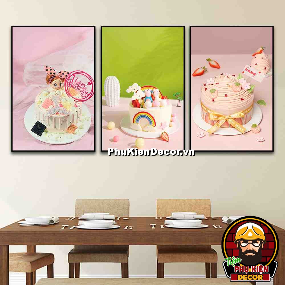3. Tranh treo tường bộ 3 bức bánh kem trang trí tiệm bánh nhiều kiểu bánh, màu sắc đặc sắc, nổi bật