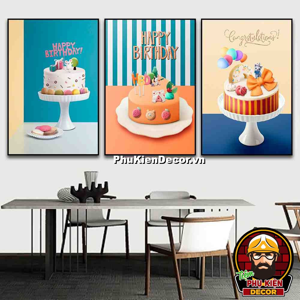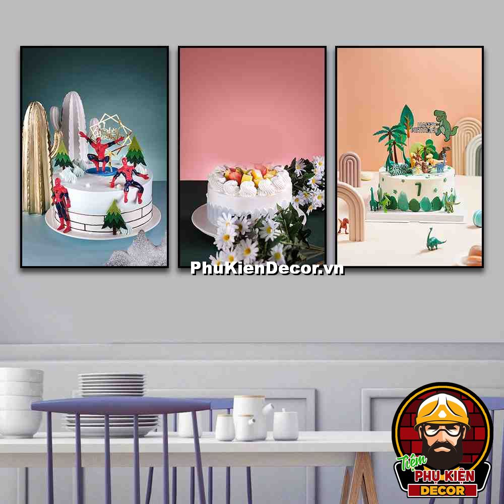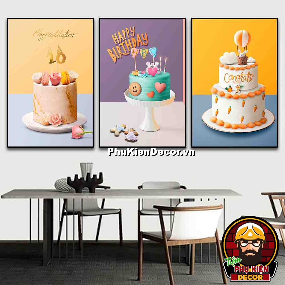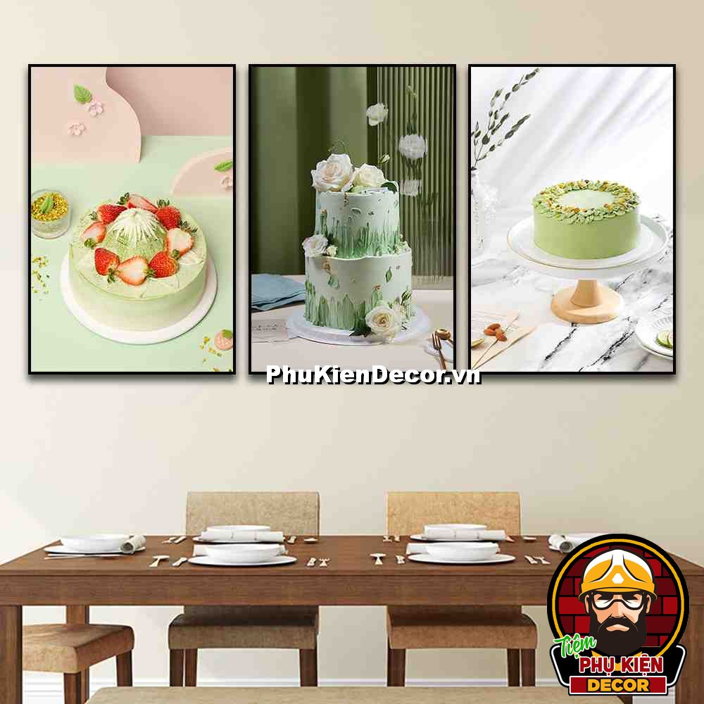 3. Tranh treo tường bộ 3 bức bánh kem trang trí tiệm bánh nhiều kiểu bánh, màu sắc đặc sắc, nổi bật