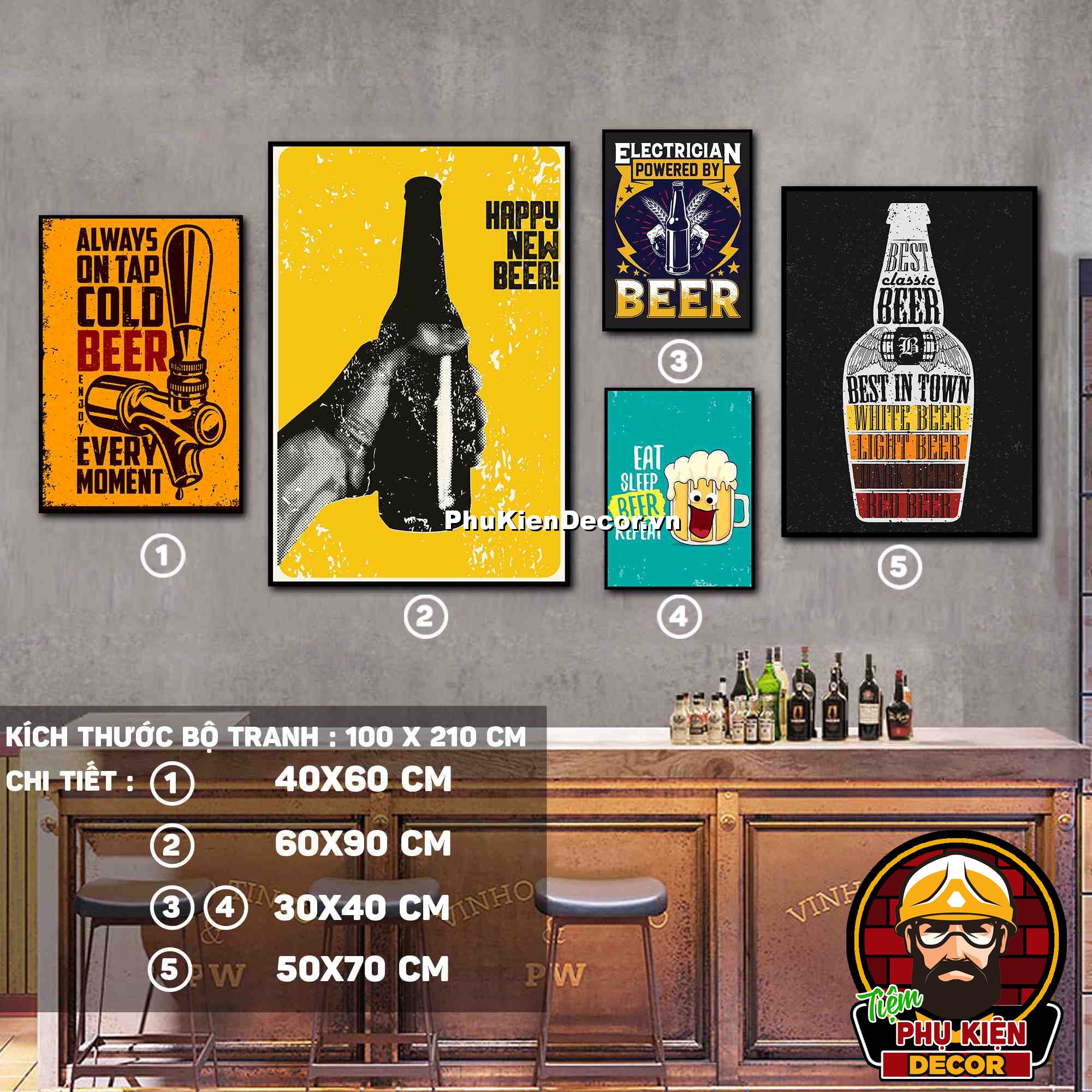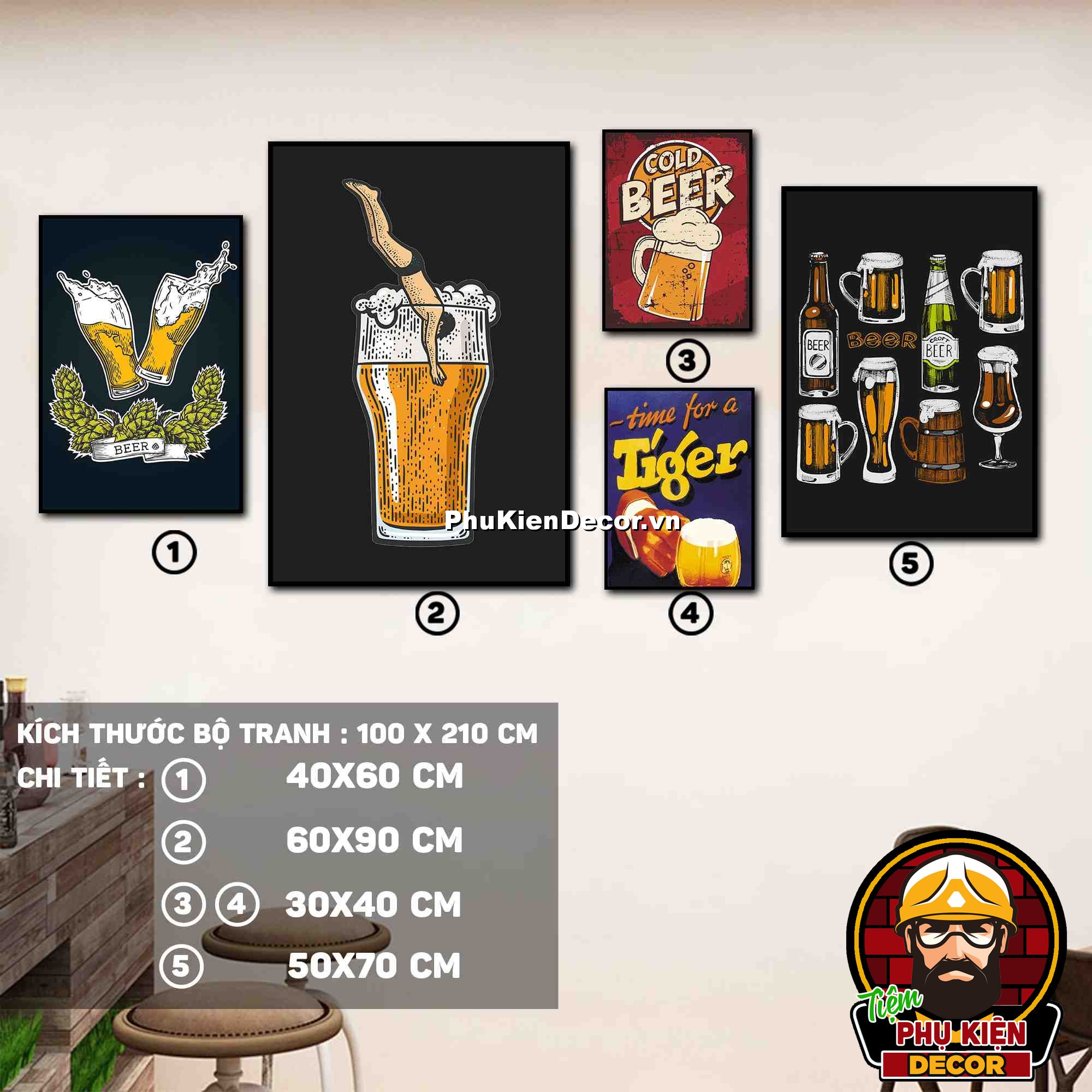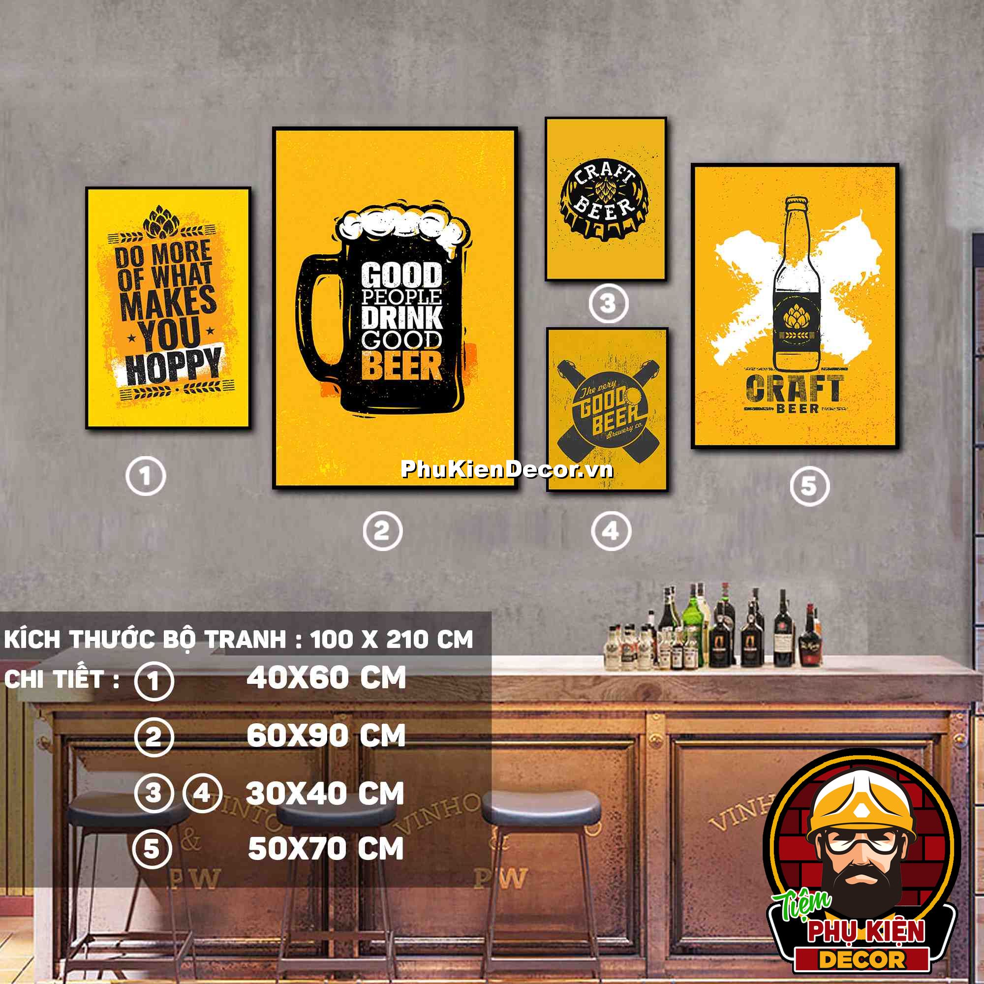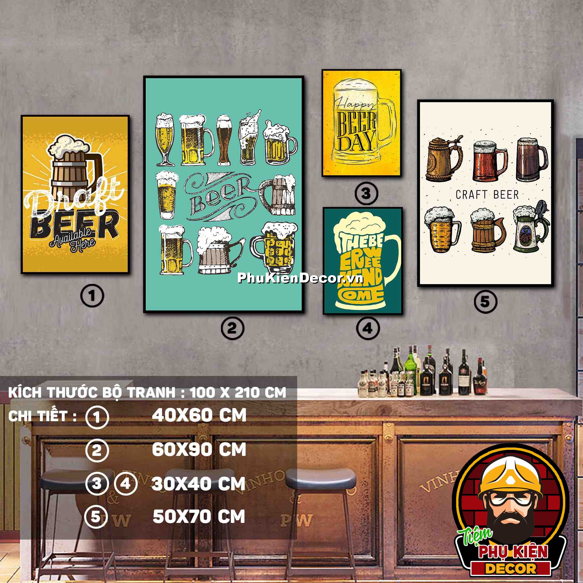 2. Tranh treo tường bộ 5 bức các kích thước xen kẽ tạo nên cấu trúc trang trí hài hòa, ấn tượng cho không gian quán beer, par - pub