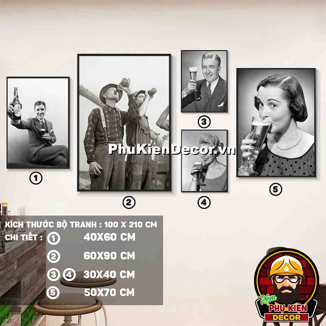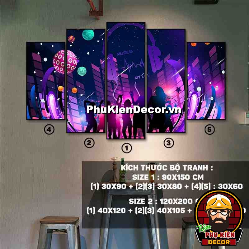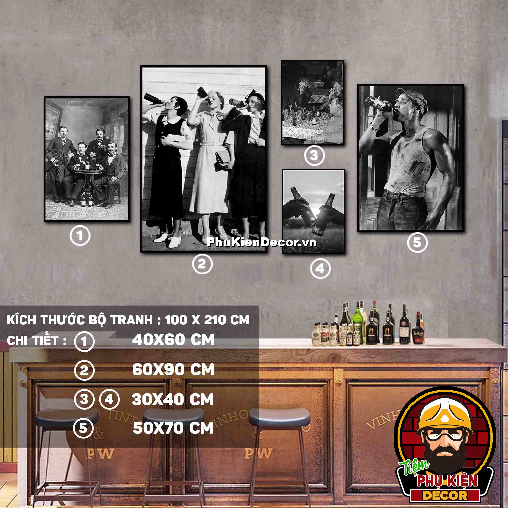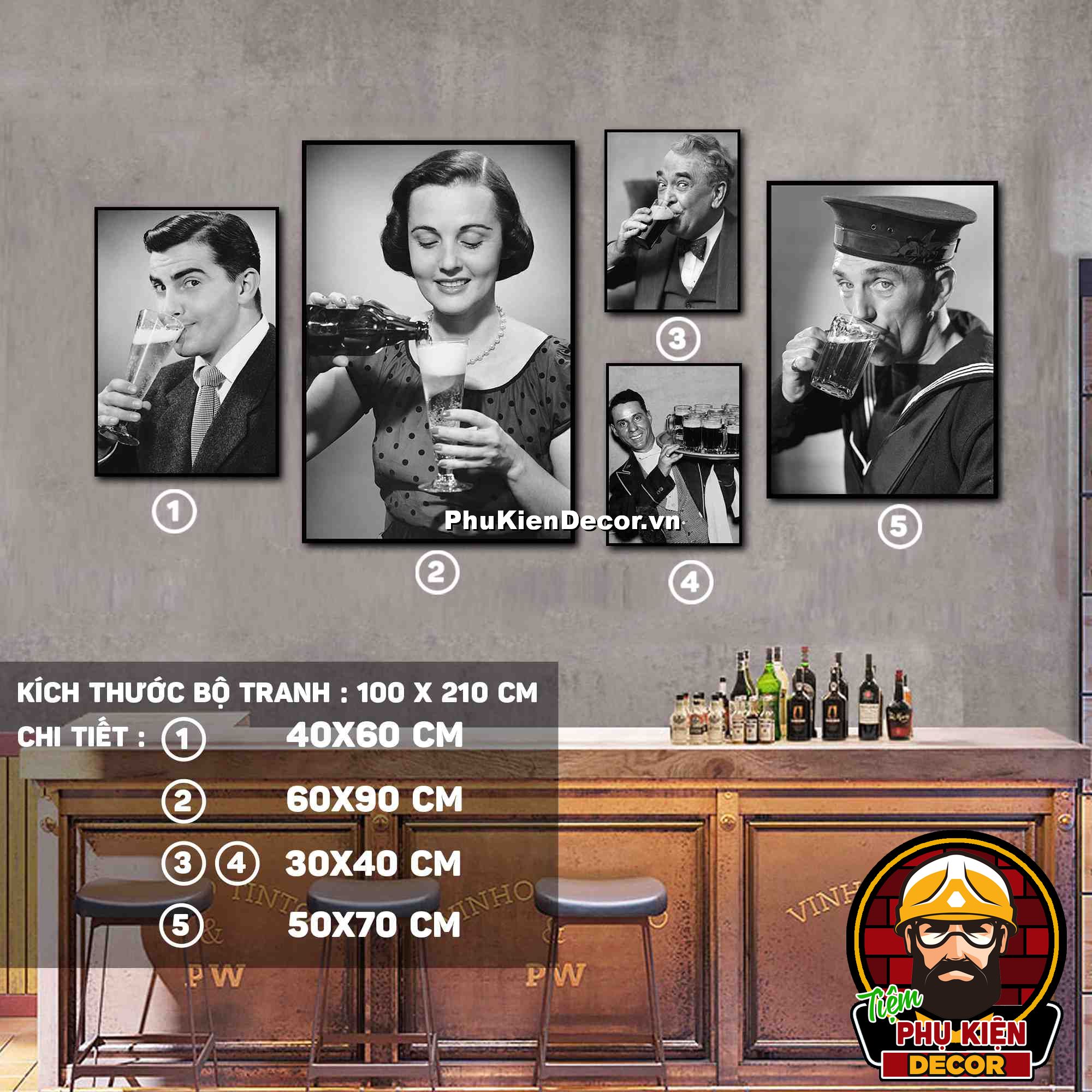 2. Tranh treo tường bộ 5 bức các kích thước xen kẽ tạo nên cấu trúc trang trí hài hòa, ấn tượng cho không gian quán beer, par - pub