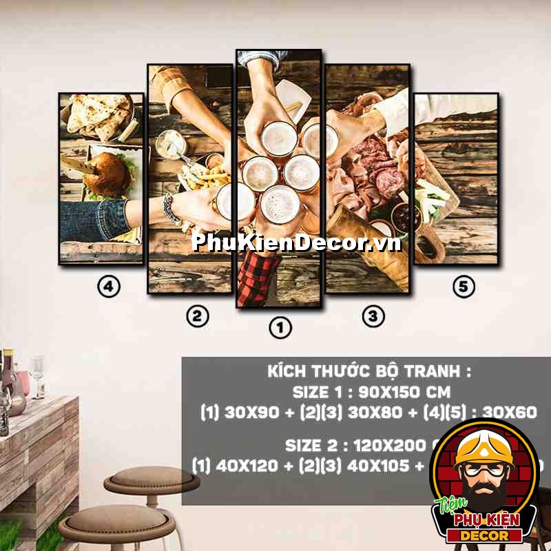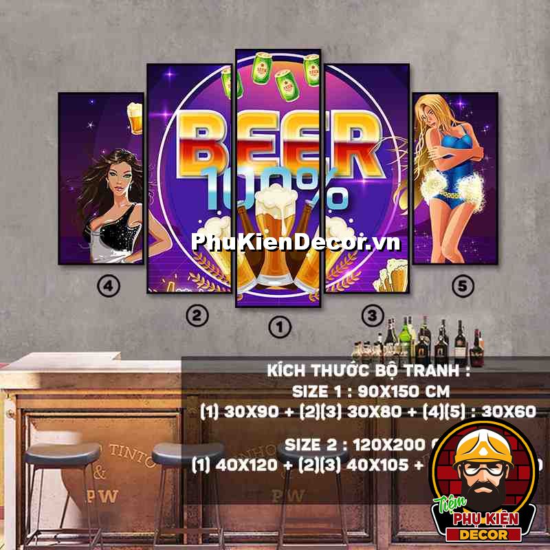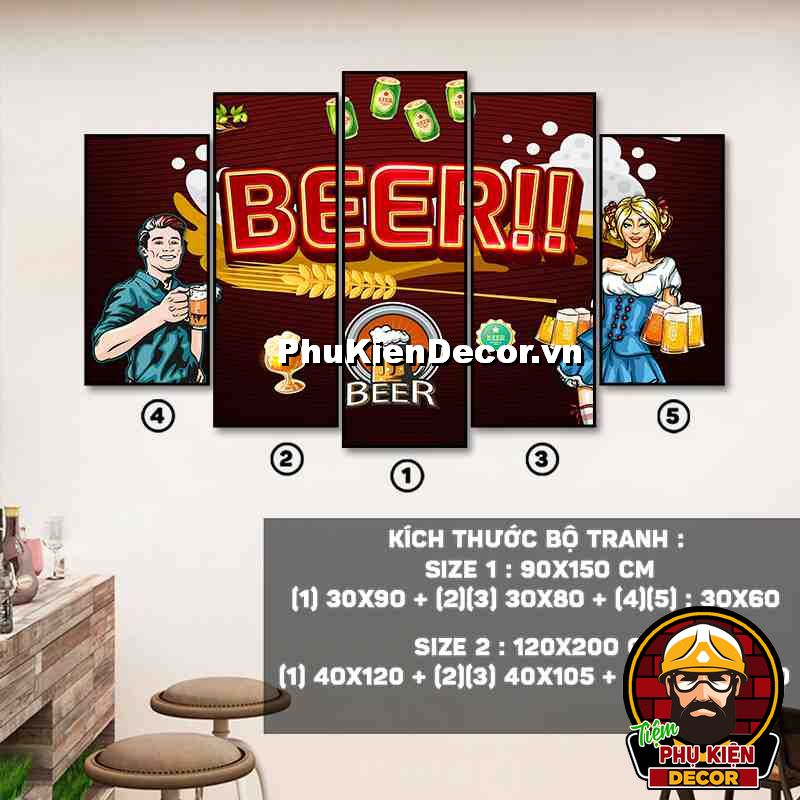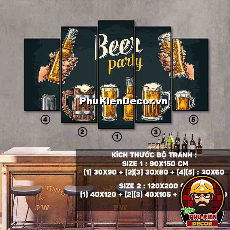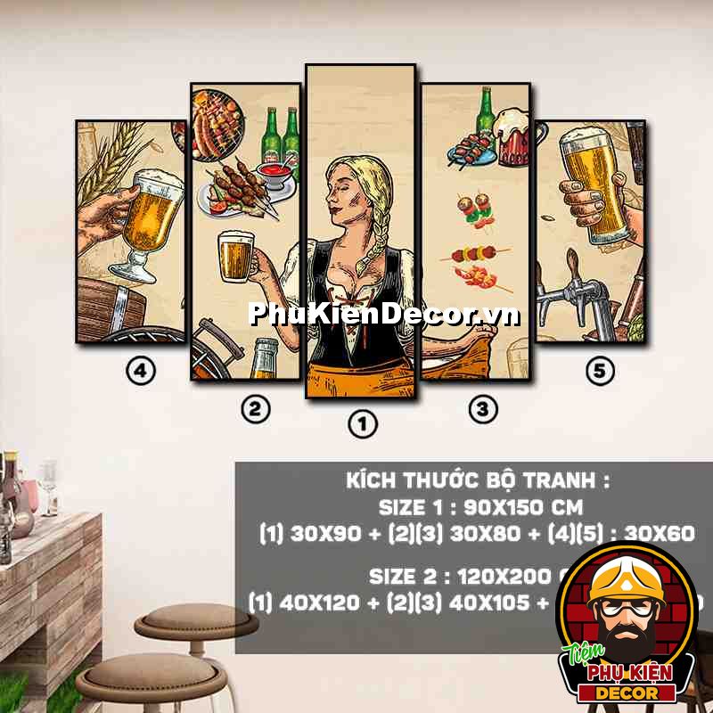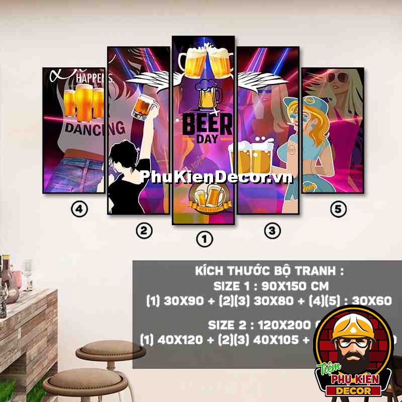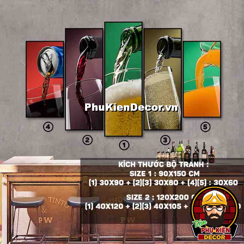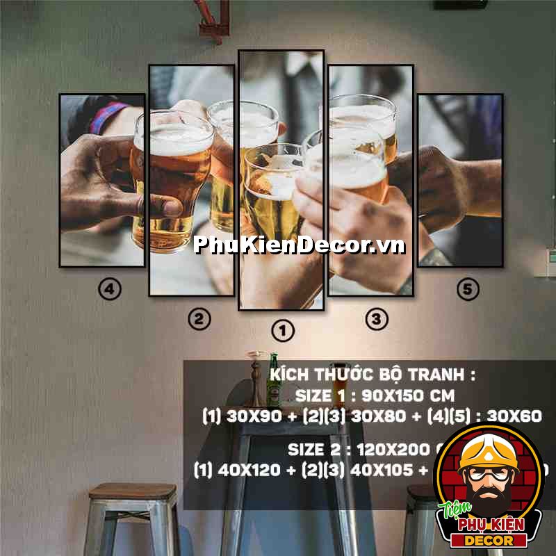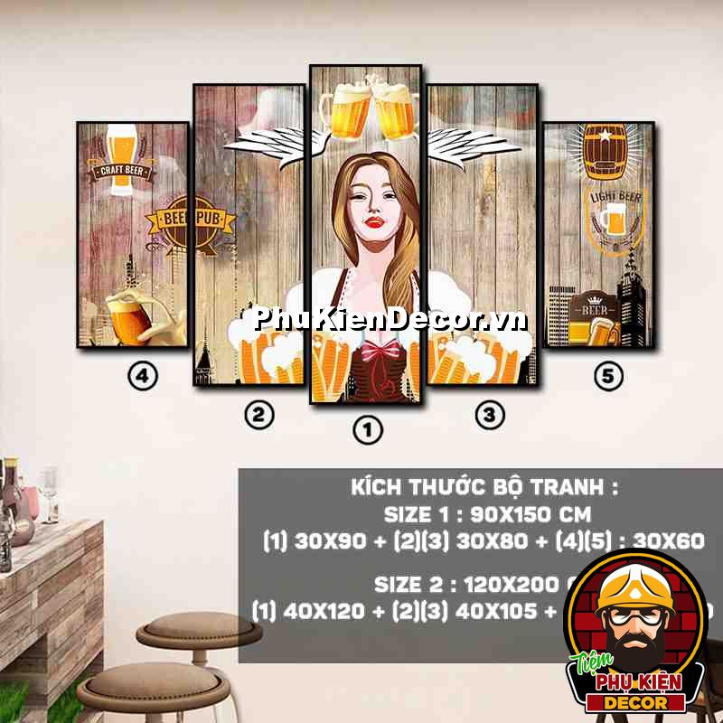 4. Tranh treo tường bộ 5 bức ghép kích thước dọc tạo điểm nhấn sáng tạo, độc đáo cho không gian quán beer, par - pub của bạn