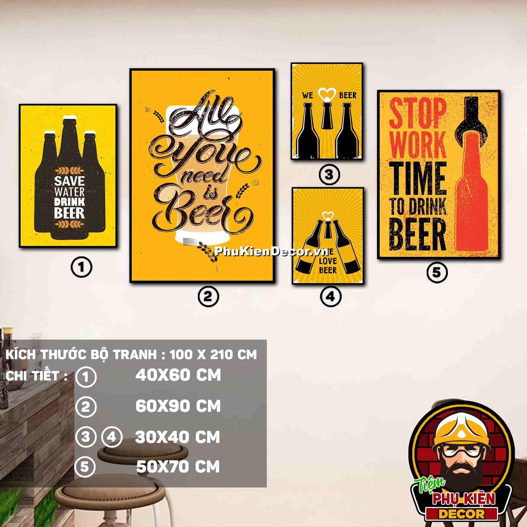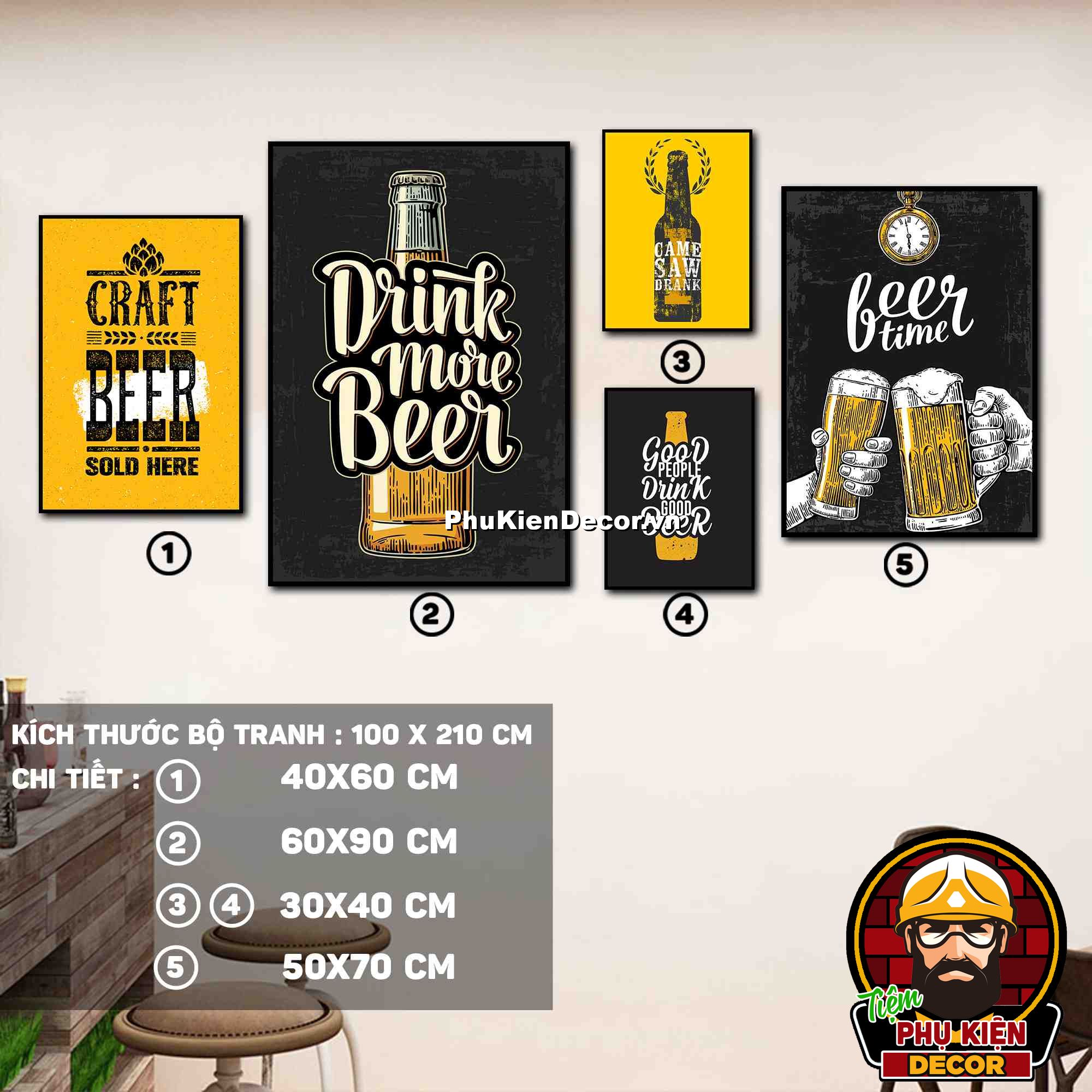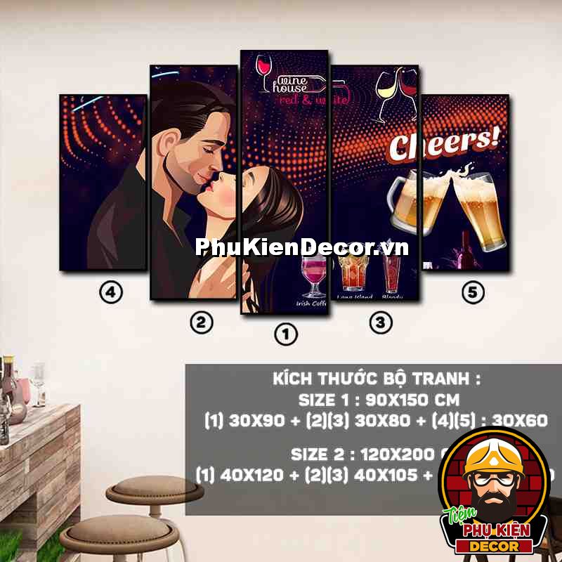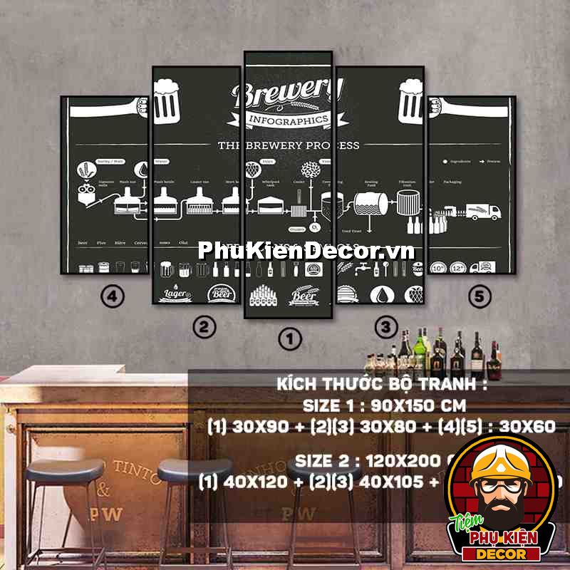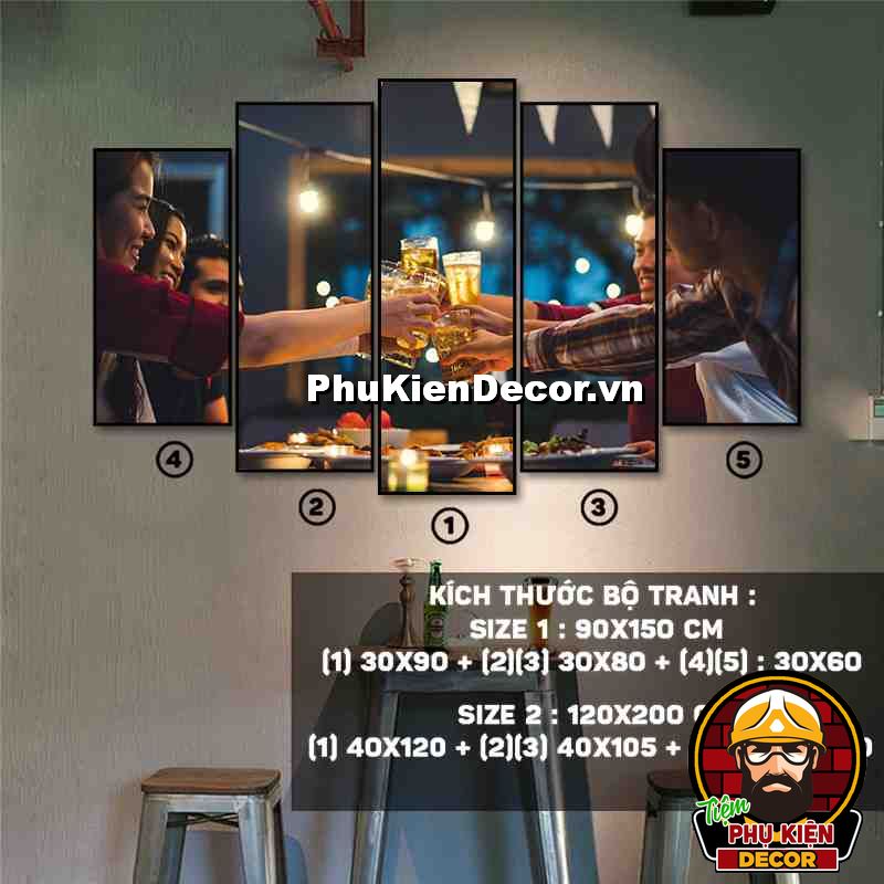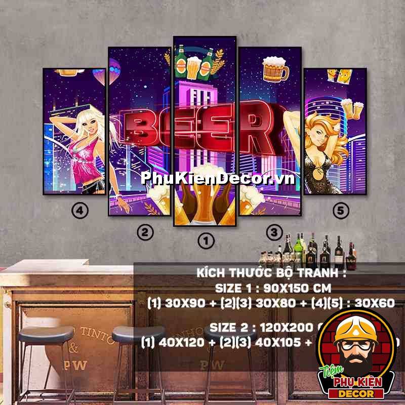 4. Tranh treo tường bộ 5 bức ghép kích thước dọc tạo điểm nhấn sáng tạo, độc đáo cho không gian quán beer, par - pub của bạn