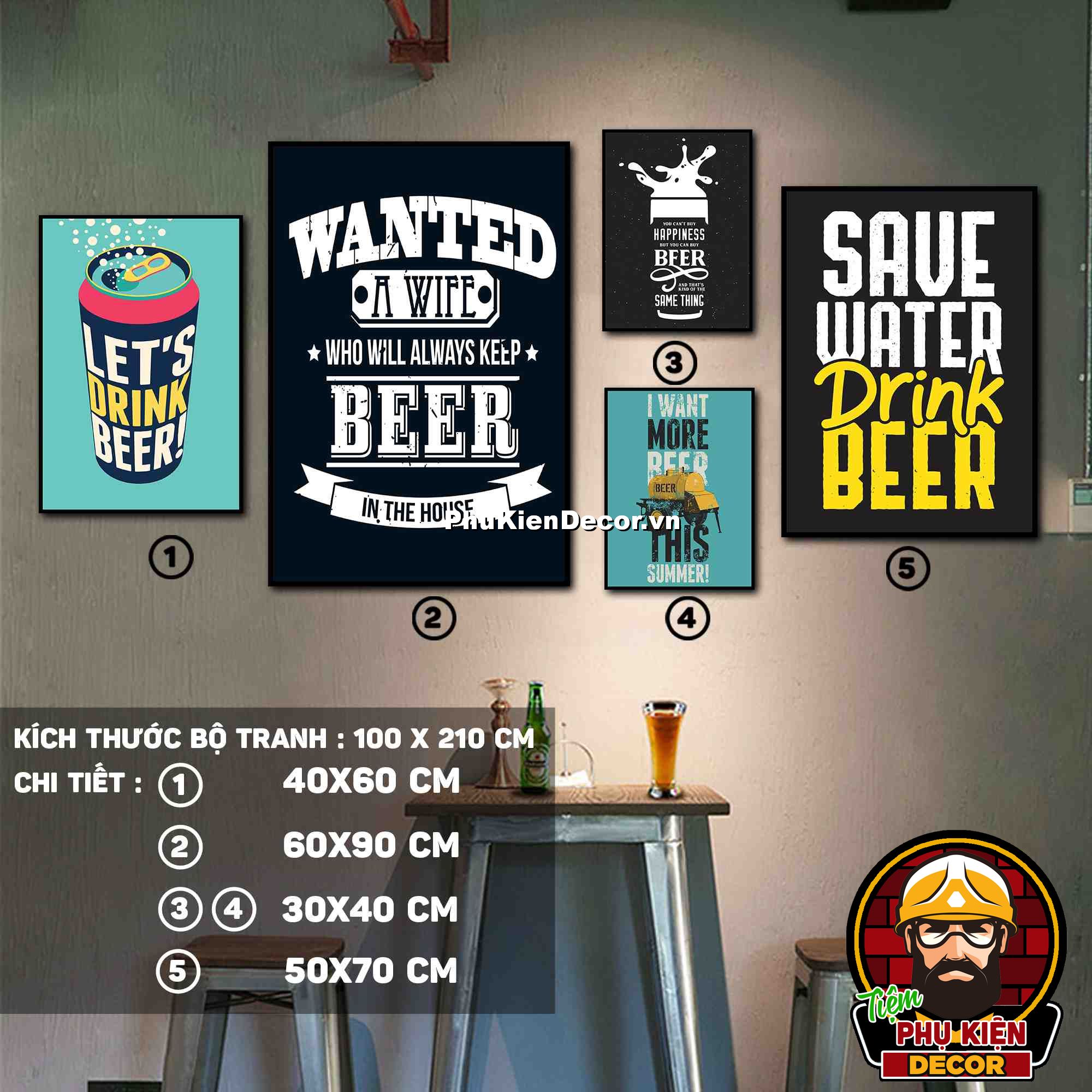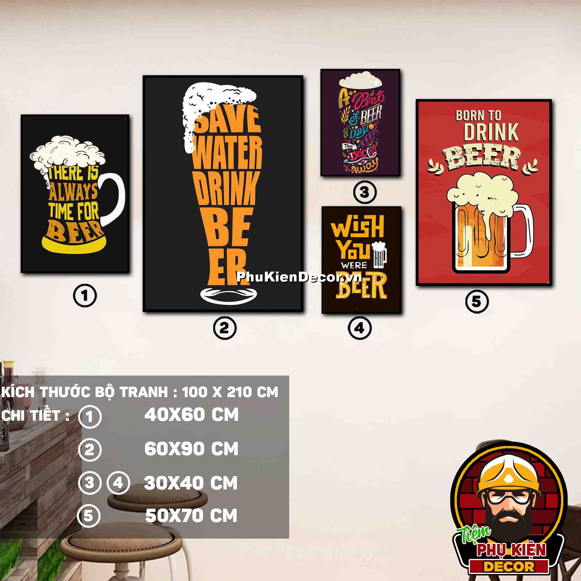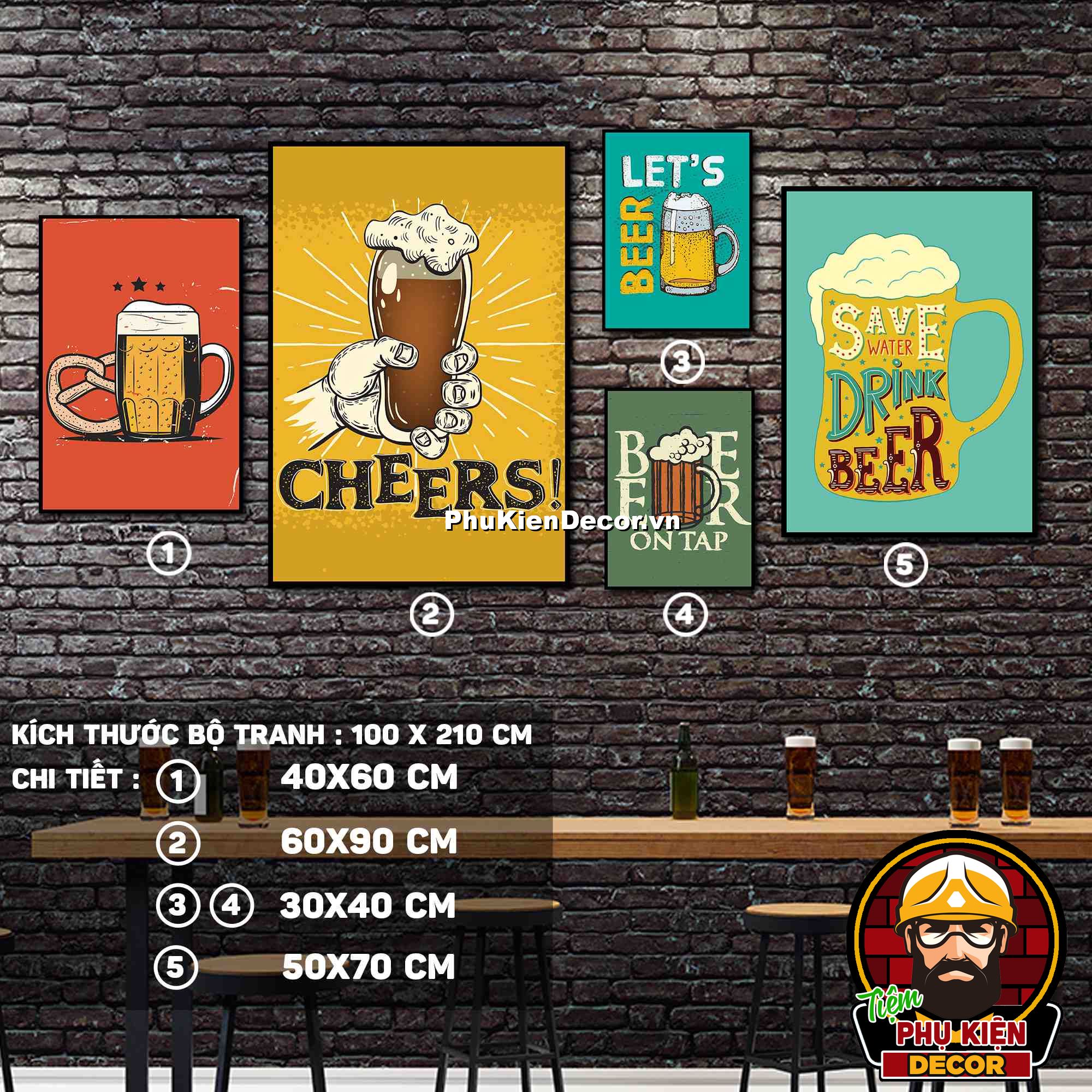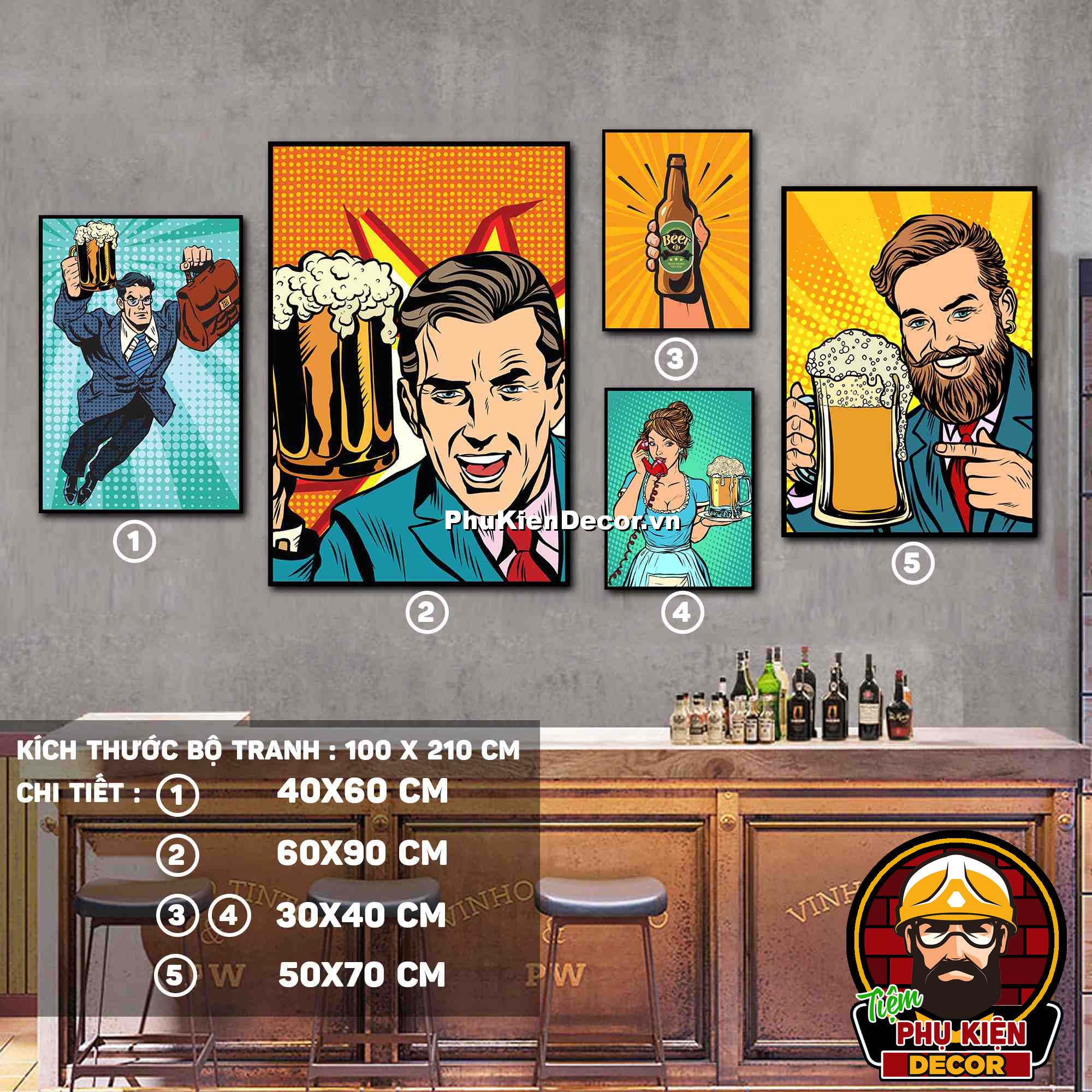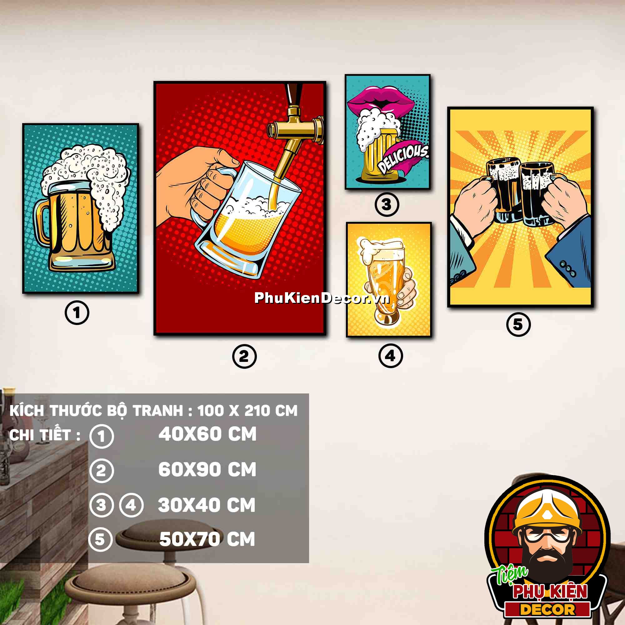4. Tranh treo tường bộ 5 bức ghép kích thước dọc tạo điểm nhấn sáng tạo, độc đáo cho không gian quán beer, par - pub của bạn