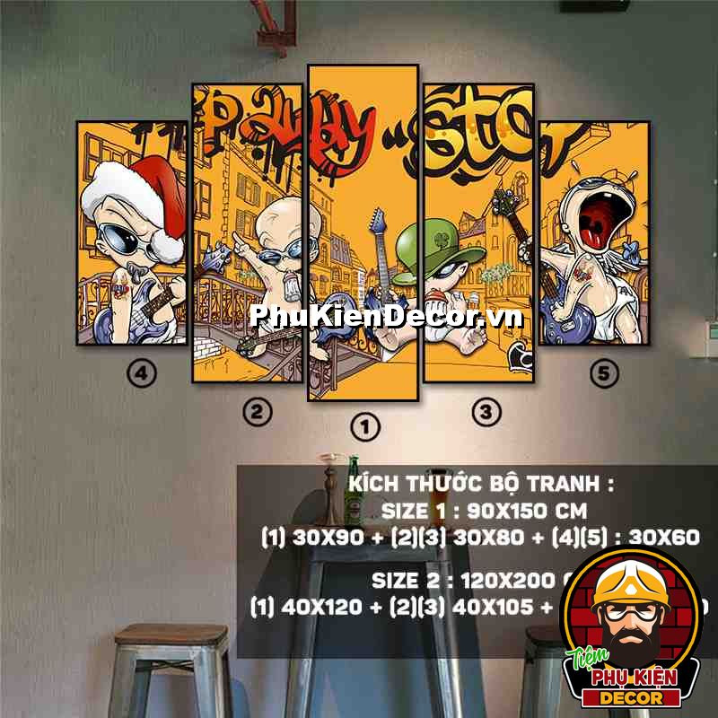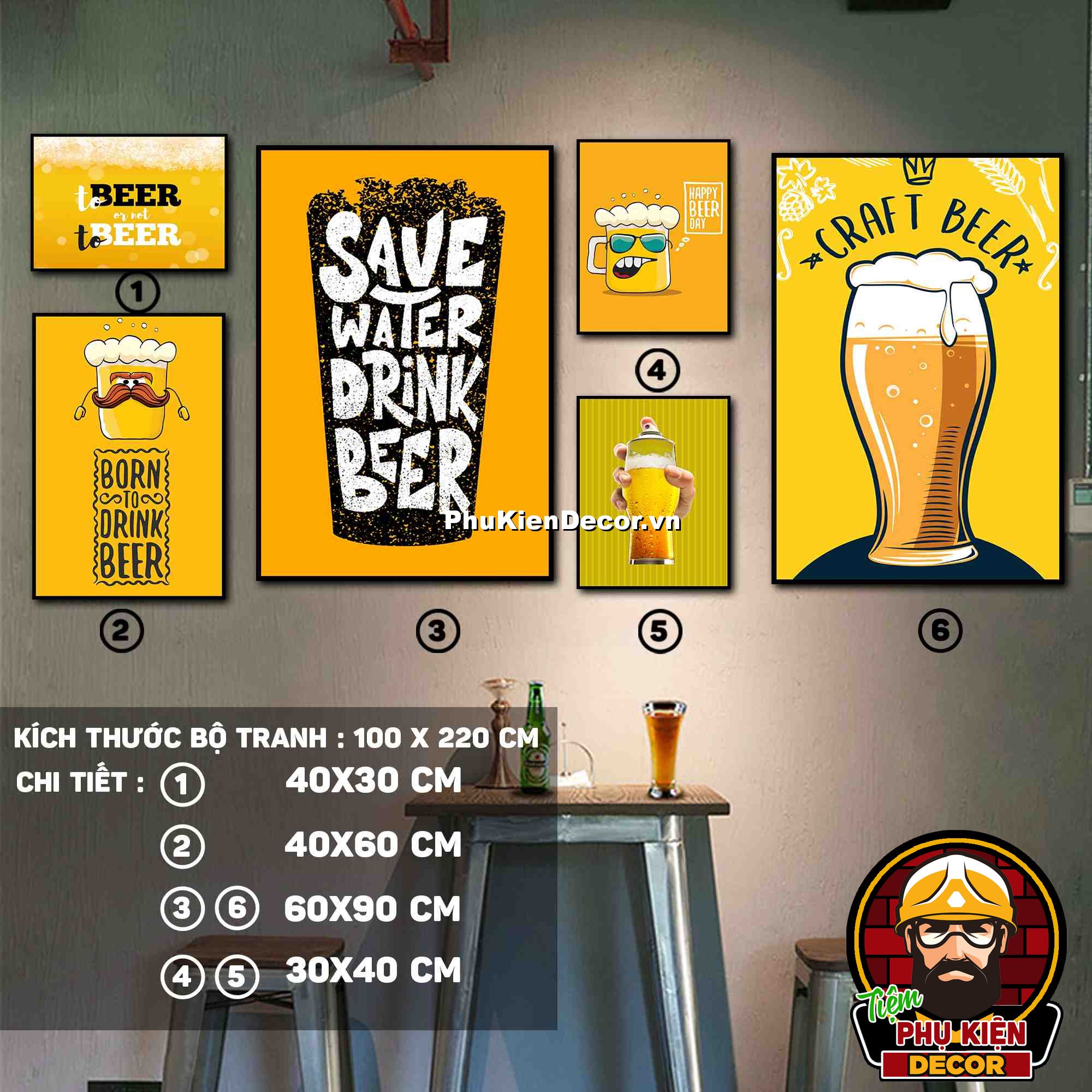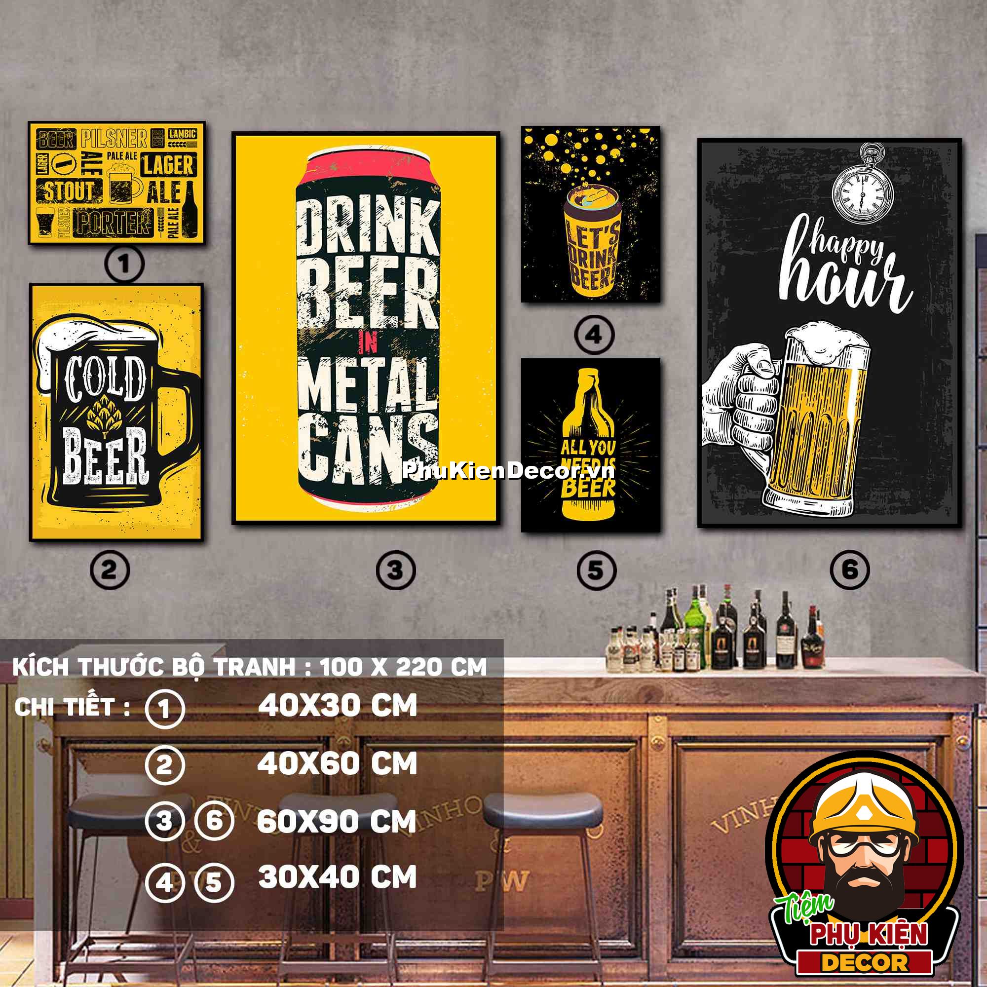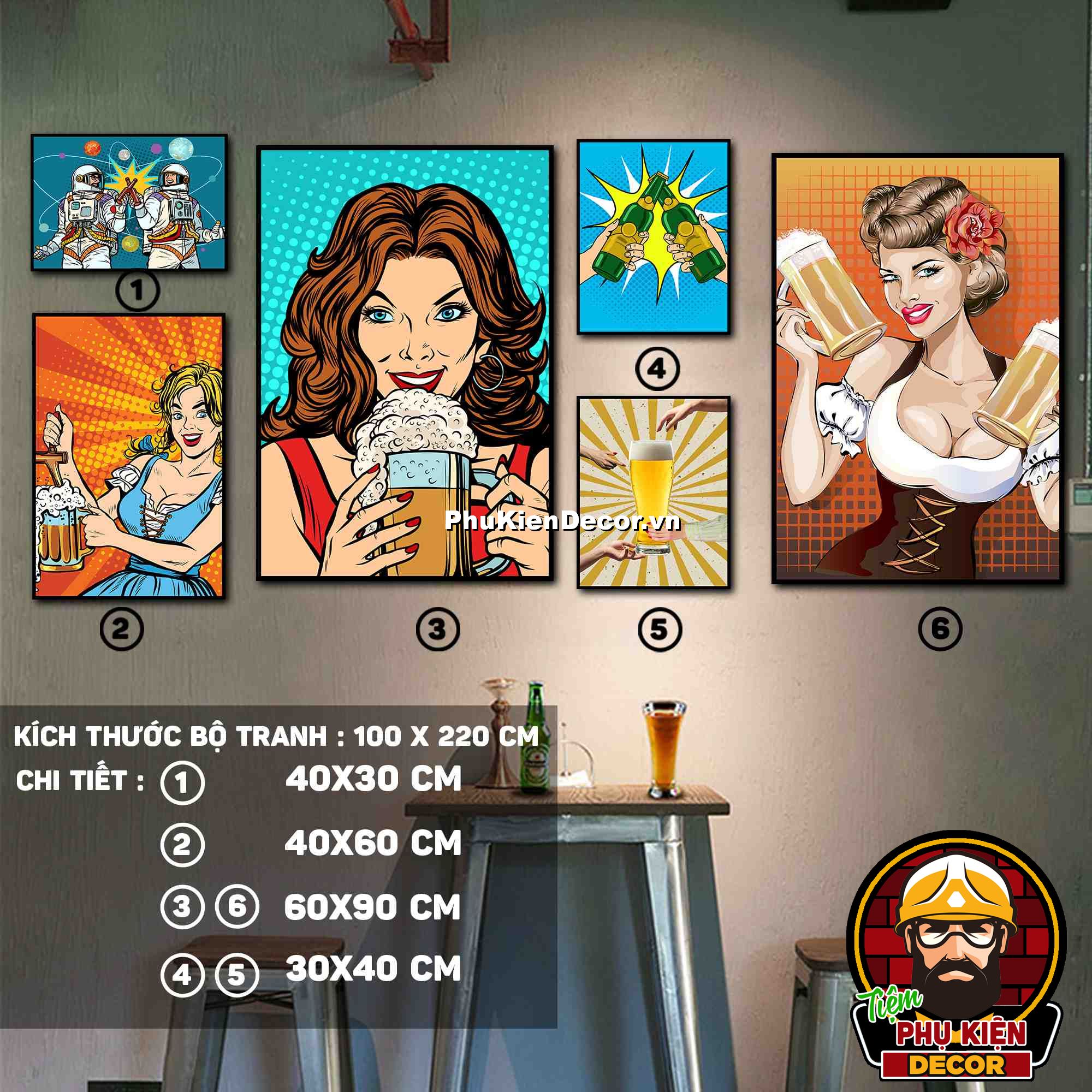 3. Tranh treo tường bộ 6 bức với các mẫu thiết kế màu sắc nổi bật cùng các chi tiết hài hước, vui nhộn tạo không gian năng động, vui tươi, thoải mái, phù hợp xu hướng cho quán beer, bar - pub