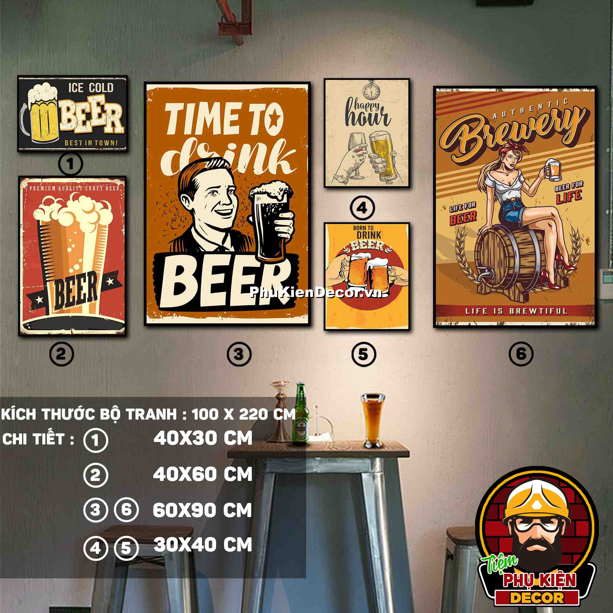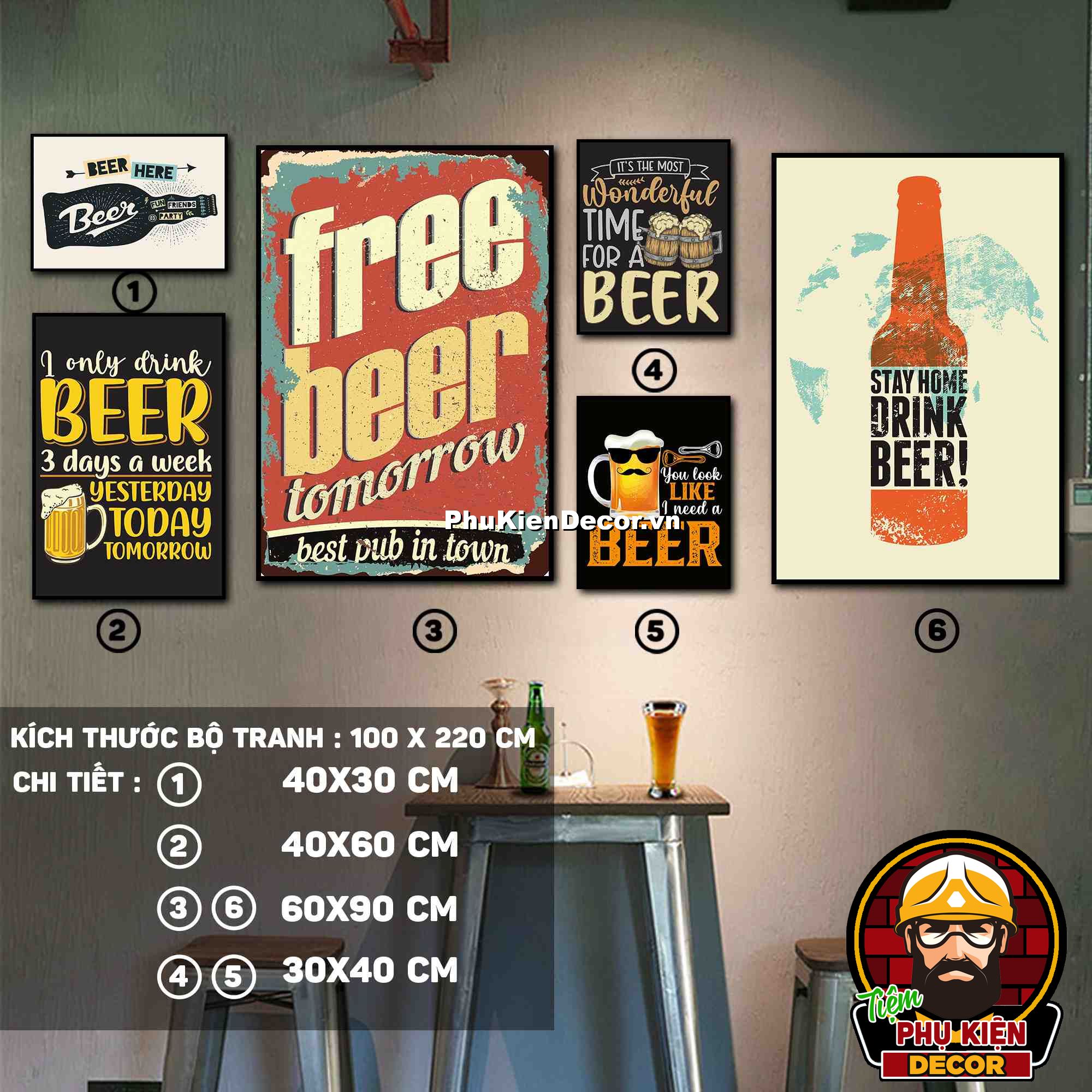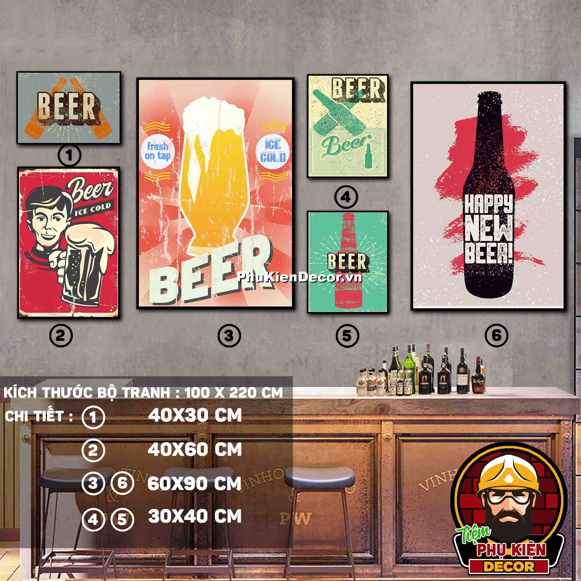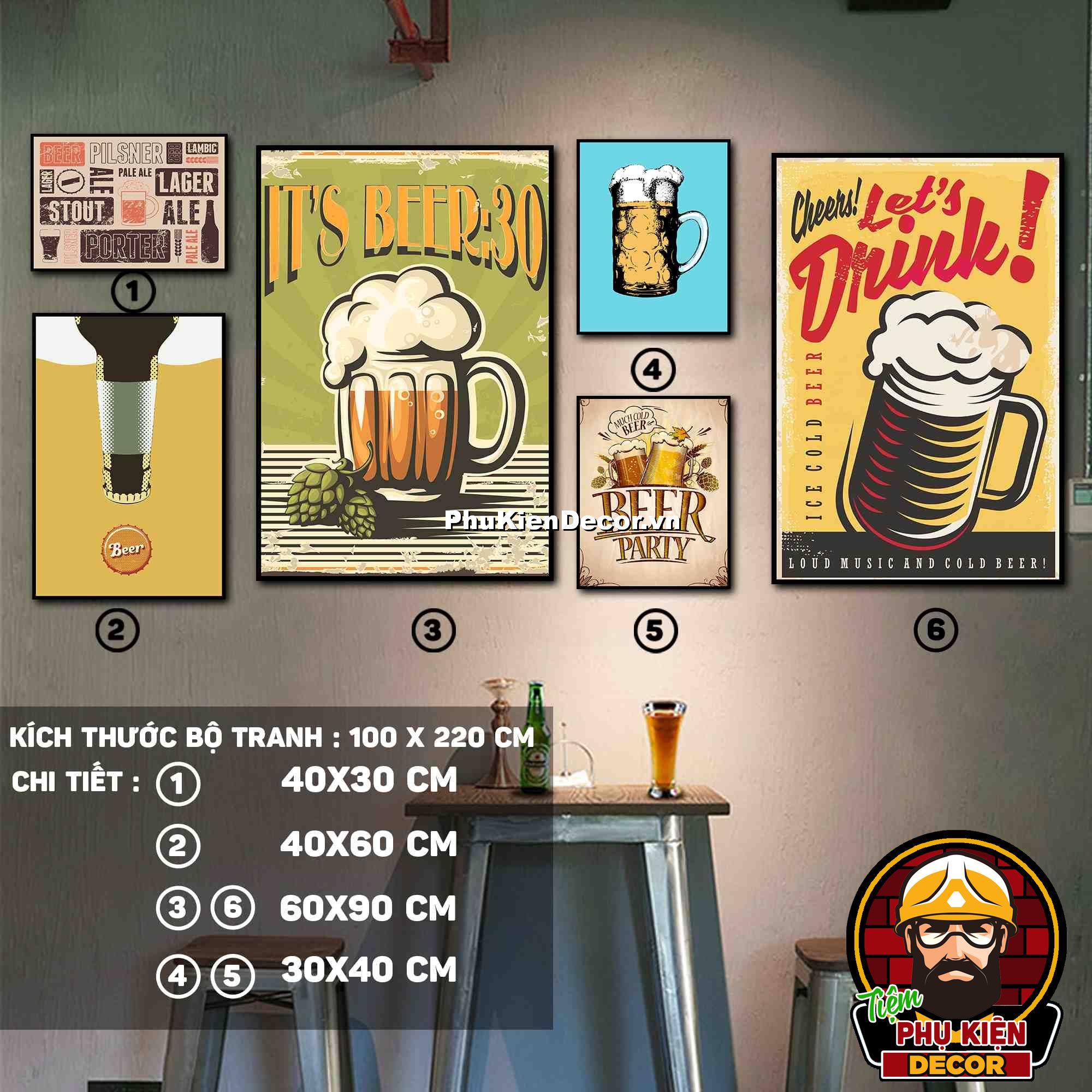 3. Tranh treo tường bộ 6 bức với các mẫu thiết kế màu sắc nổi bật cùng các chi tiết hài hước, vui nhộn tạo không gian năng động, vui tươi, thoải mái, phù hợp xu hướng cho quán beer, bar - pub