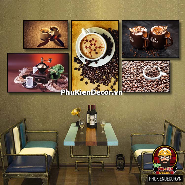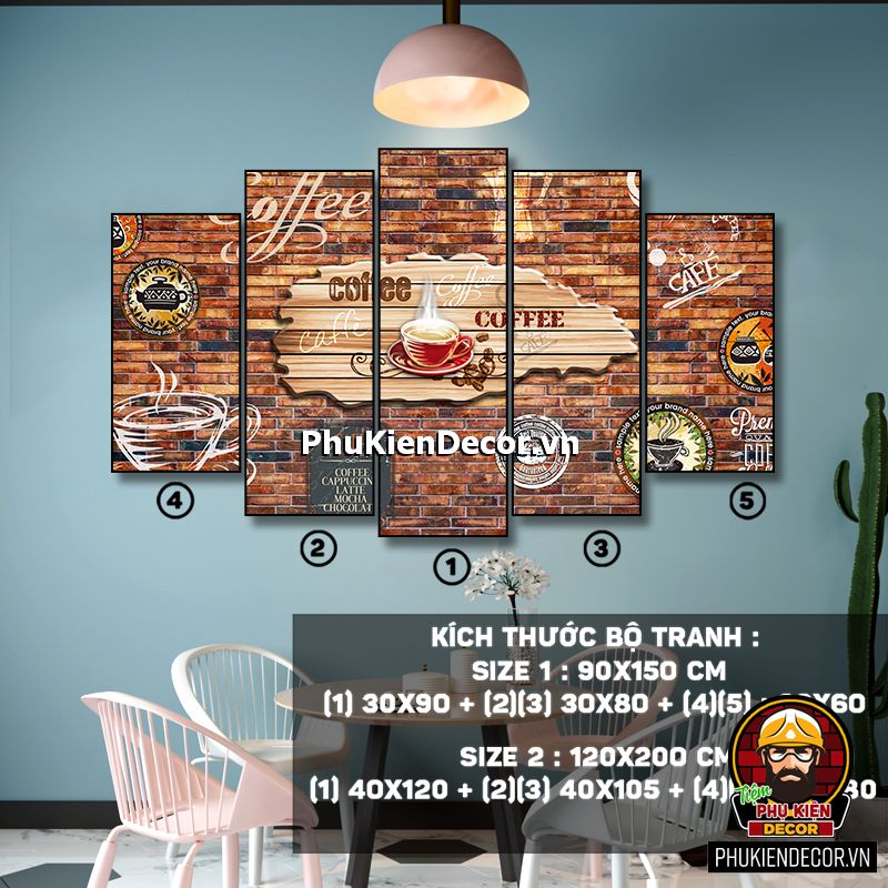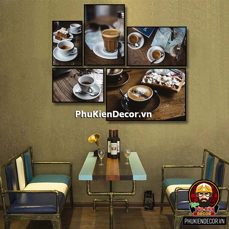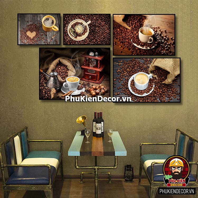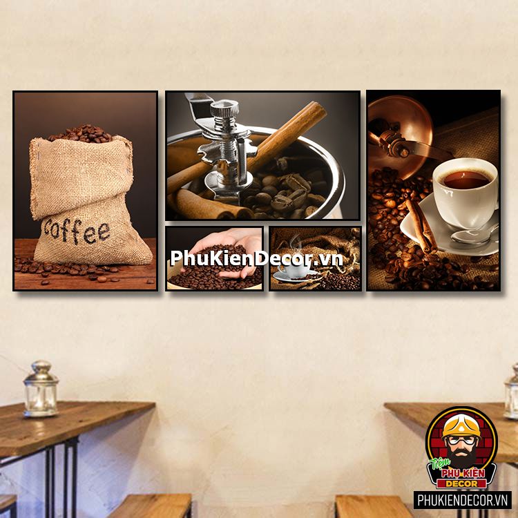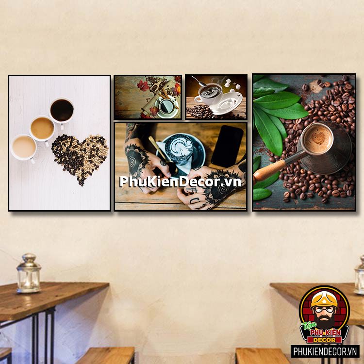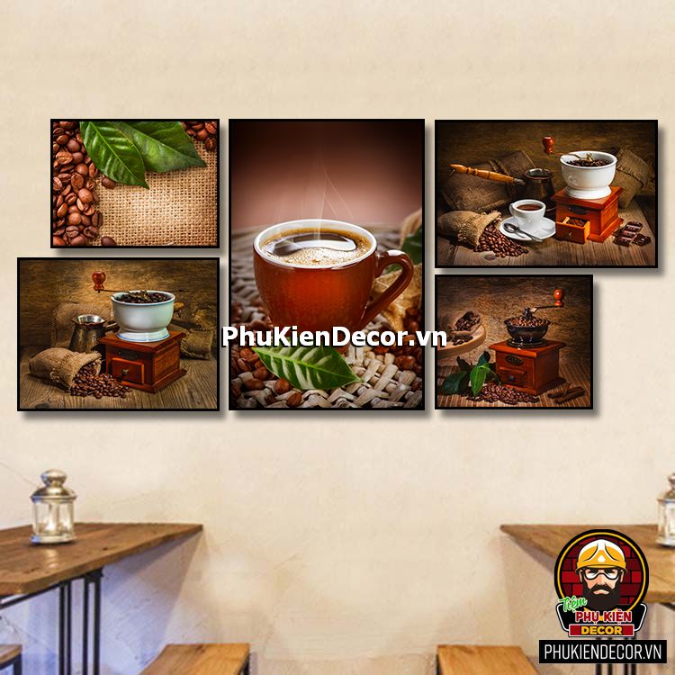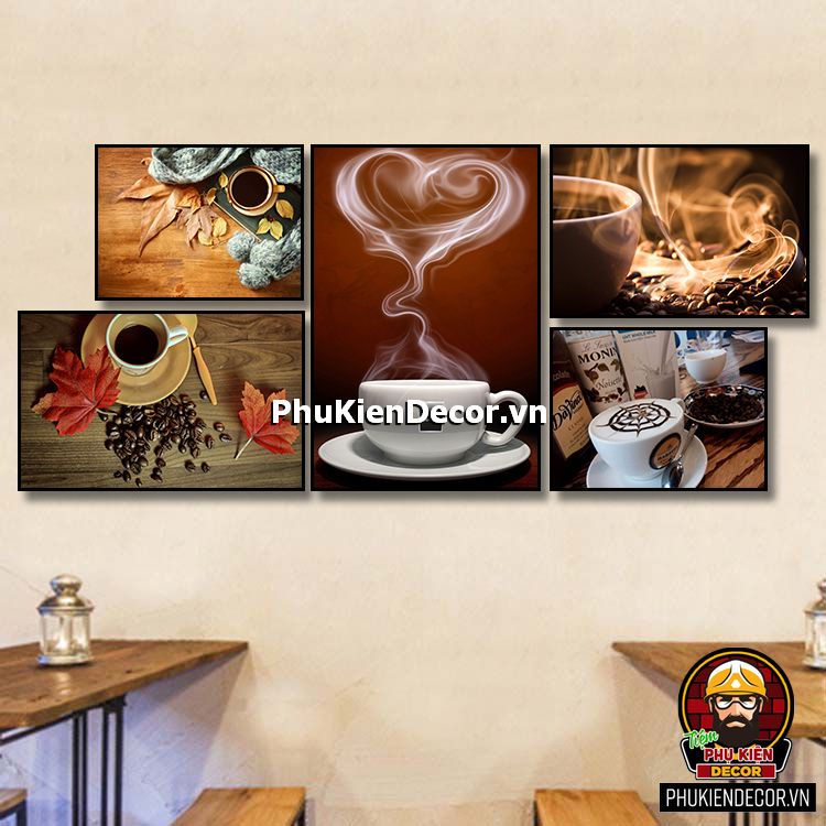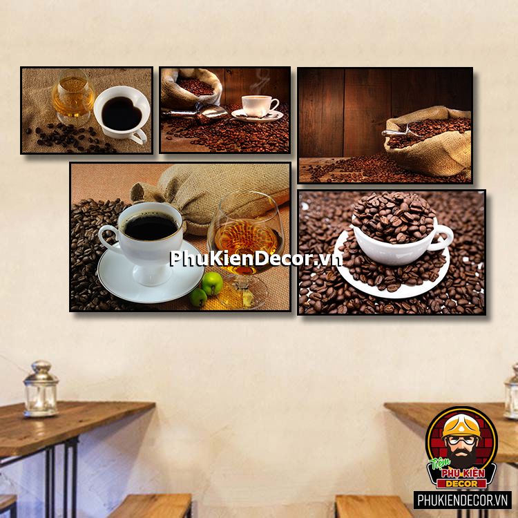 Các bộ tranh cafe 5 bức gồm nhiều kích thước đa dạng, trang trí đan xen góp phần tạo không gian nổi bật, thú vị, lạ mắt.