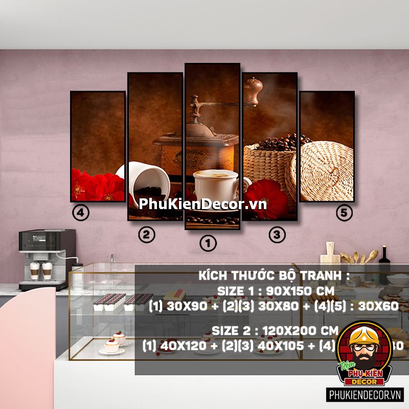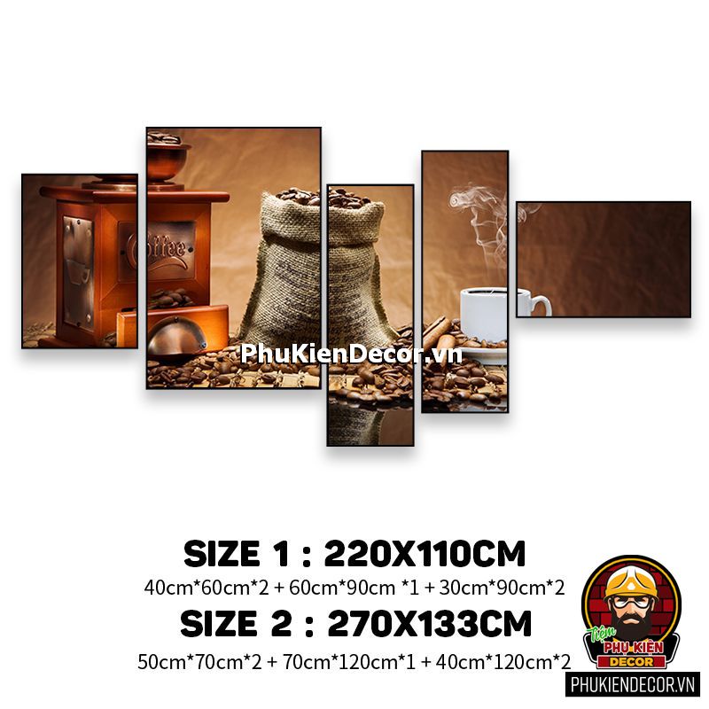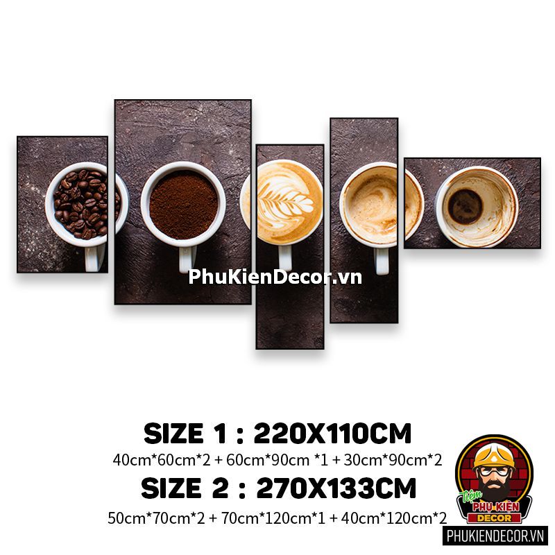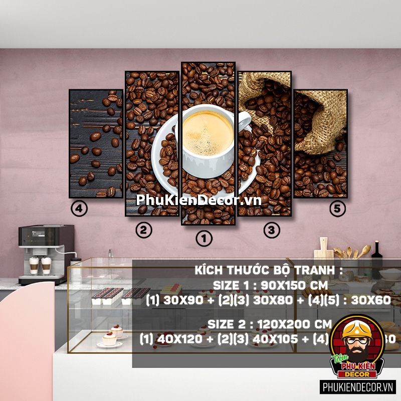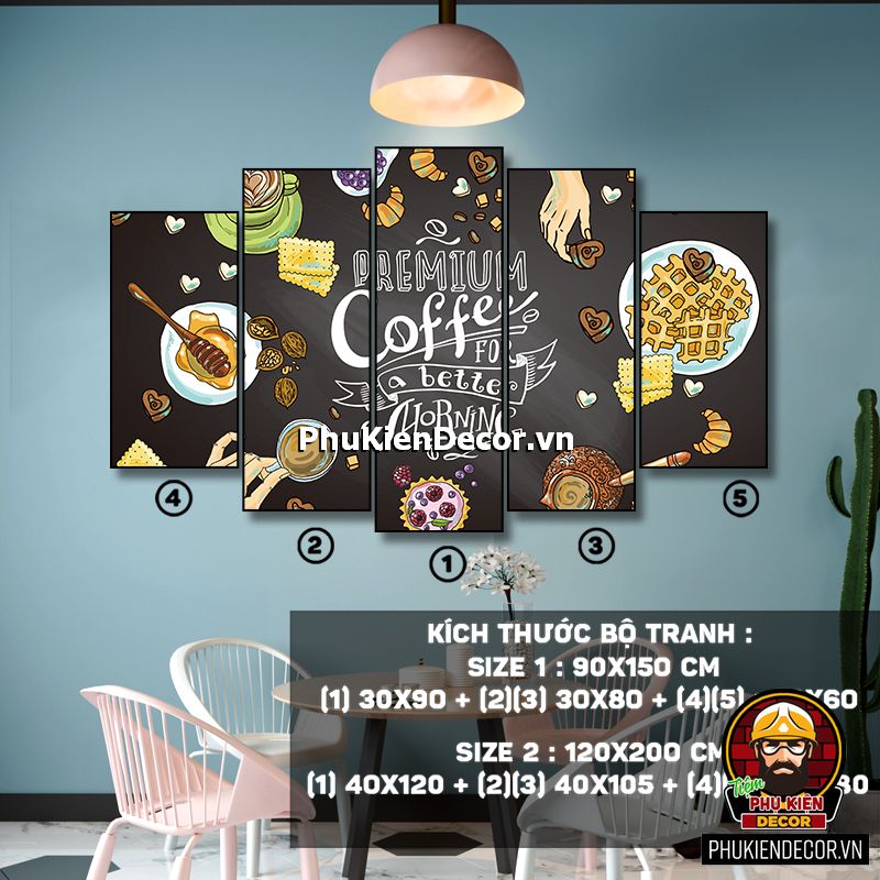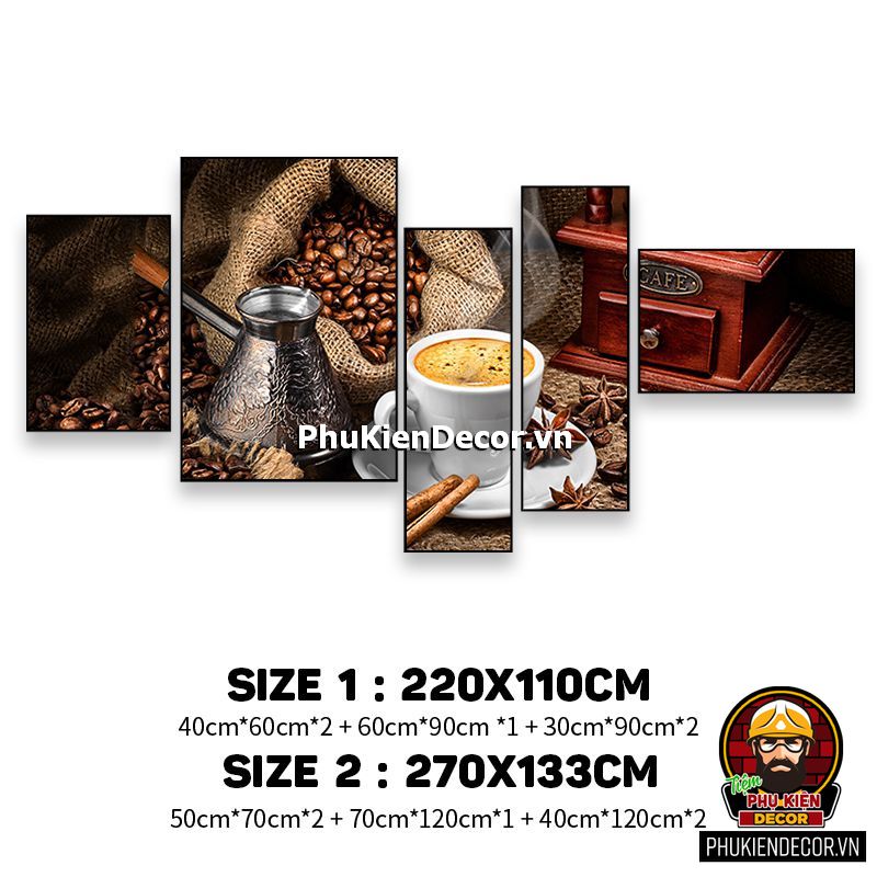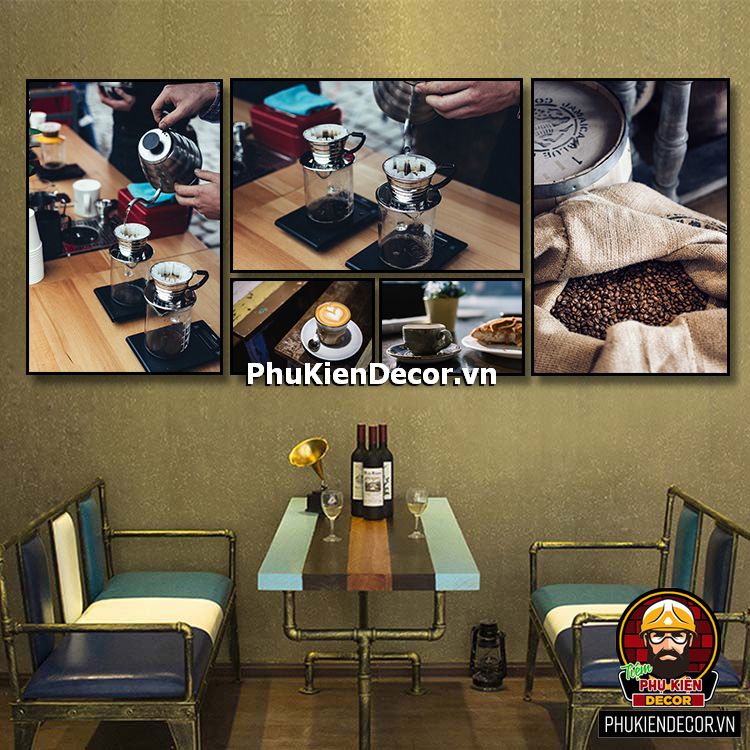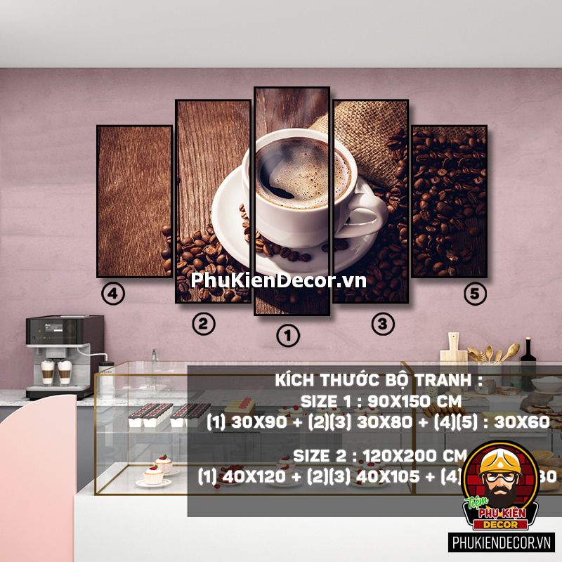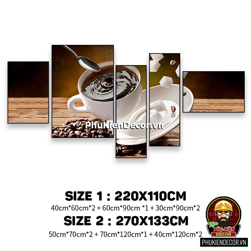 Các bộ tranh cafe 5 bức gồm nhiều kích thước đa dạng, trang trí đan xen góp phần tạo không gian nổi bật, thú vị, lạ mắt.