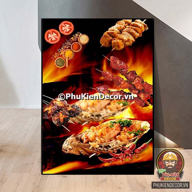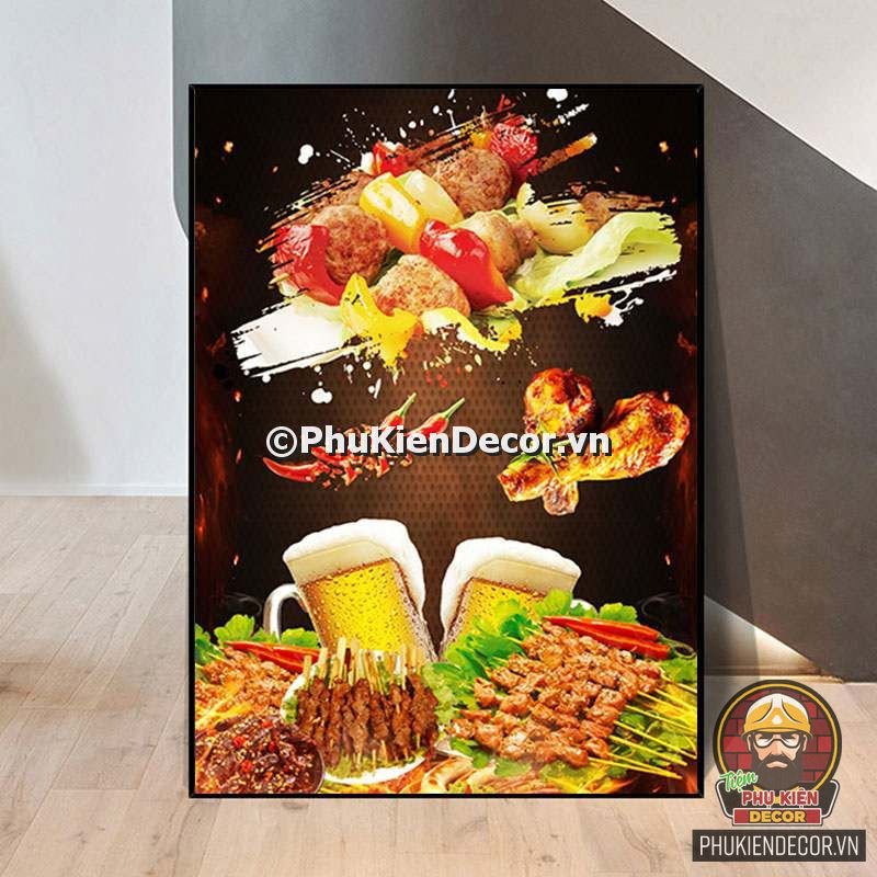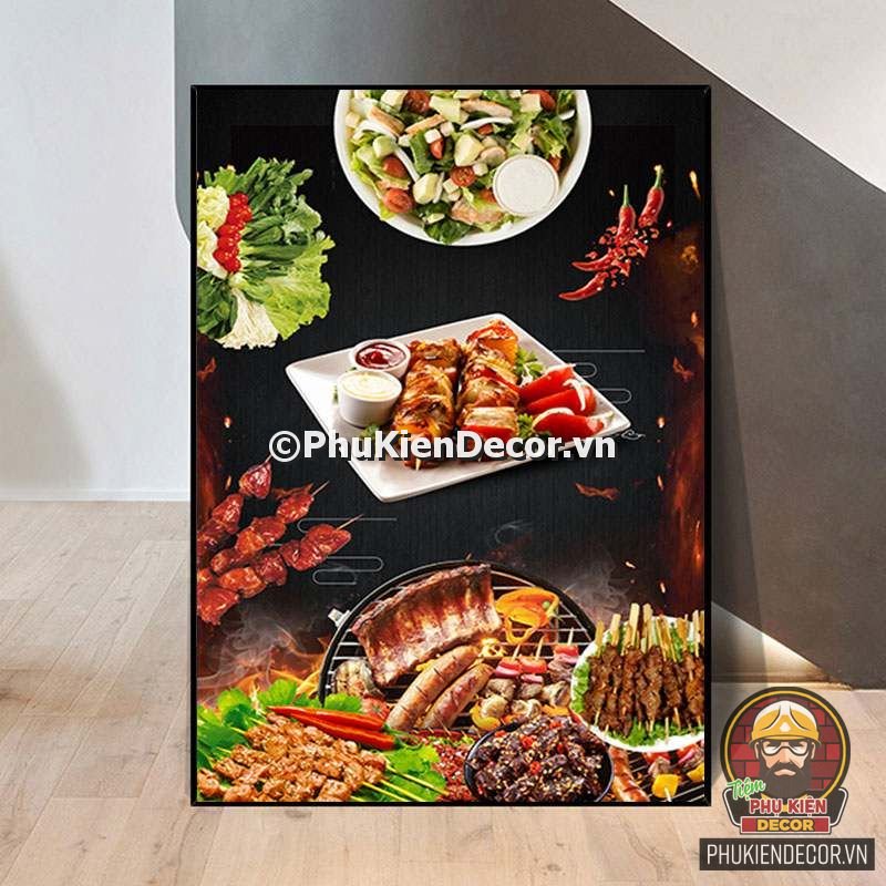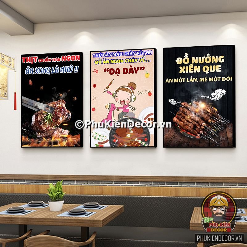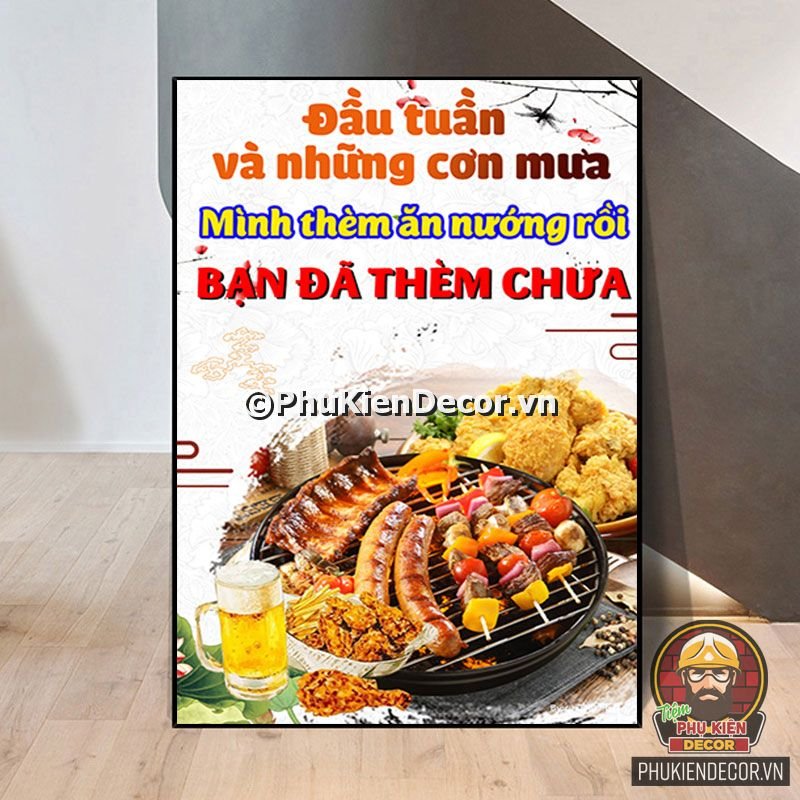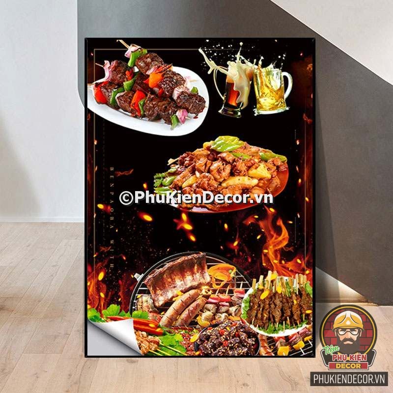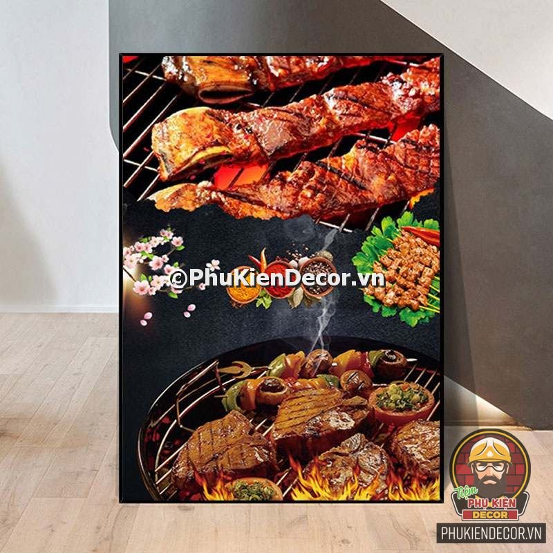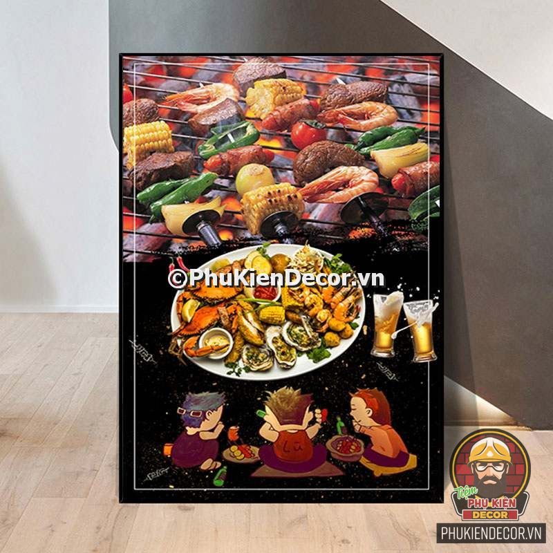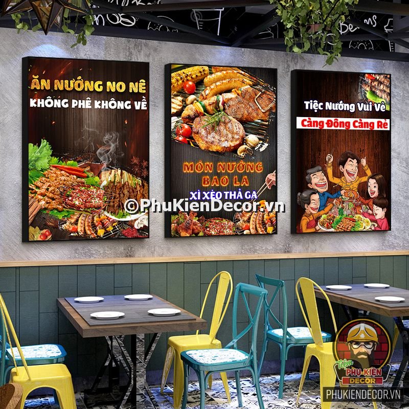 2. Tranh treo tường trang trí quán nướng với thiết kế màu sắc nổi bật, tươi tắn và hình ảnh, slogan vui nhộn, thú vị tạo nên không gian trải nghiệm món ngon và tận hưởng không khí thoải mái cho thực khách